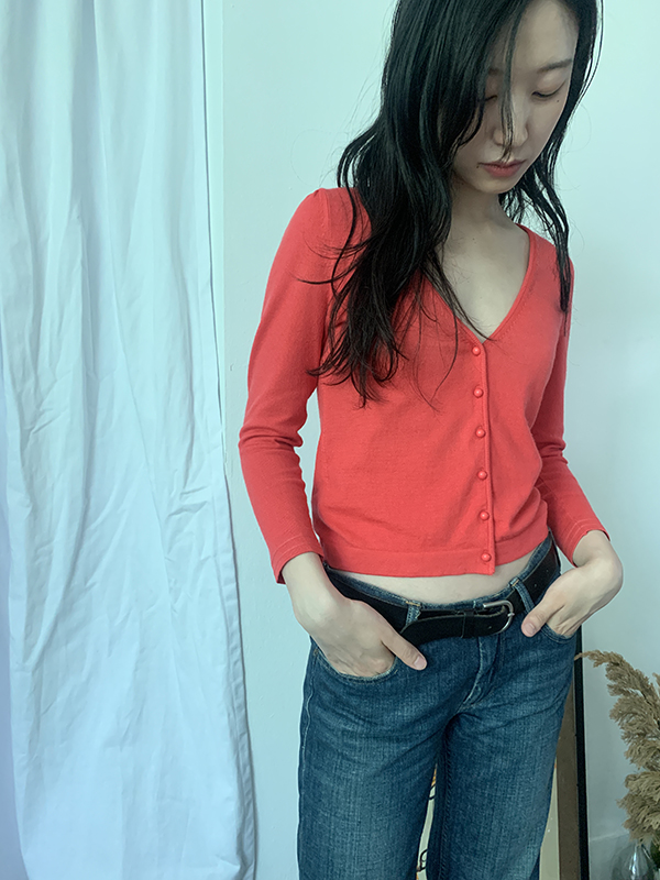 다홍빛의 촉감이 부드러운 카디건입니다.