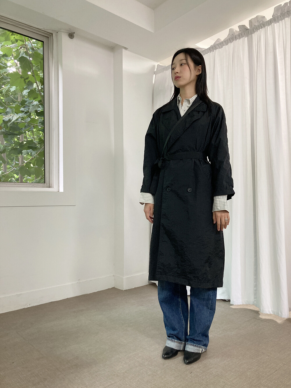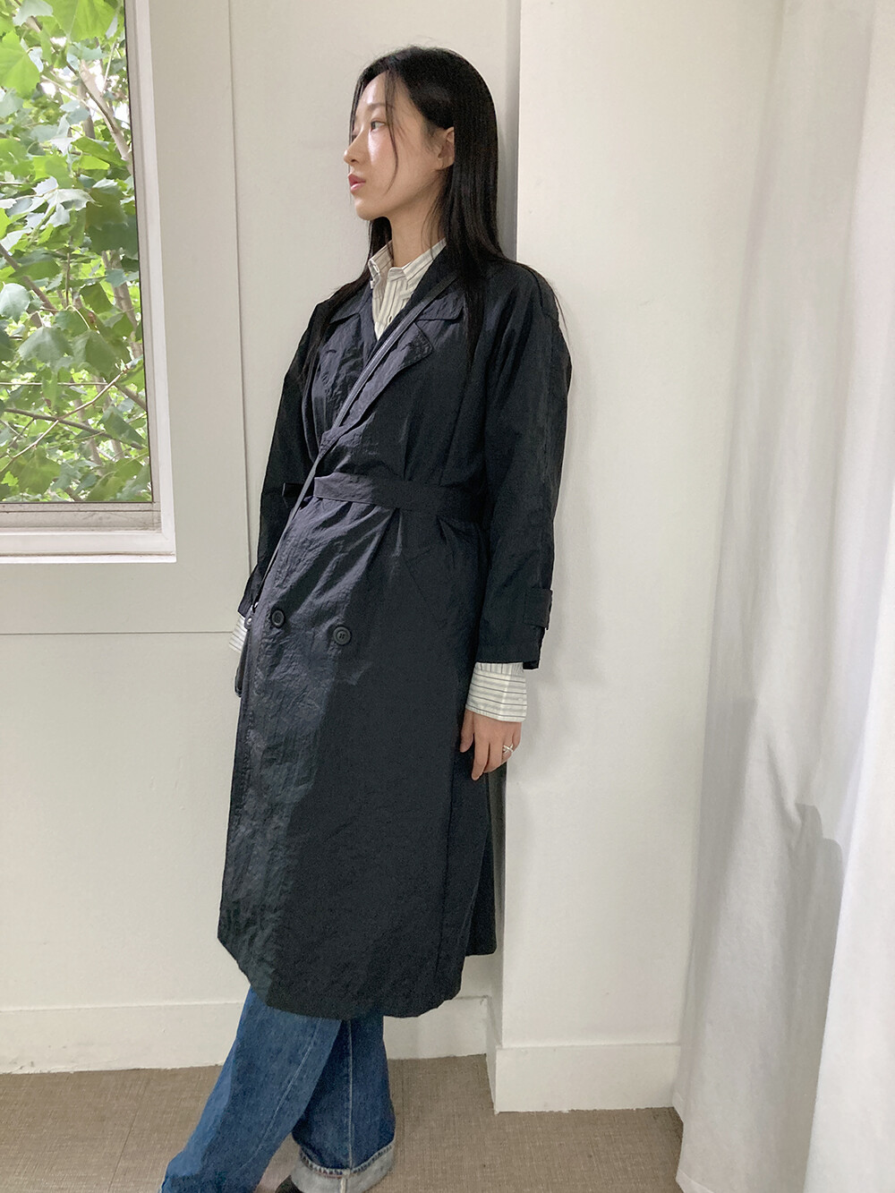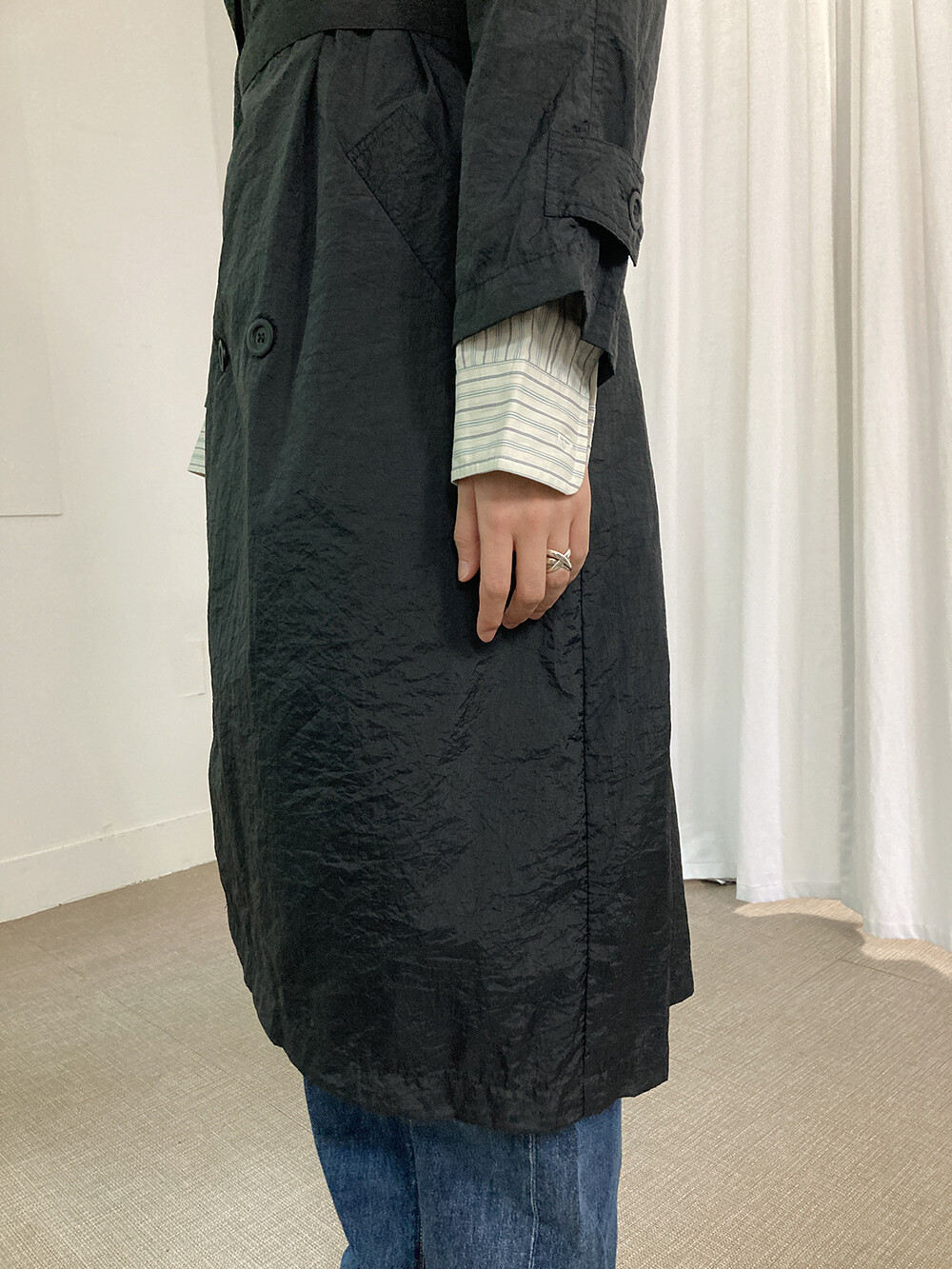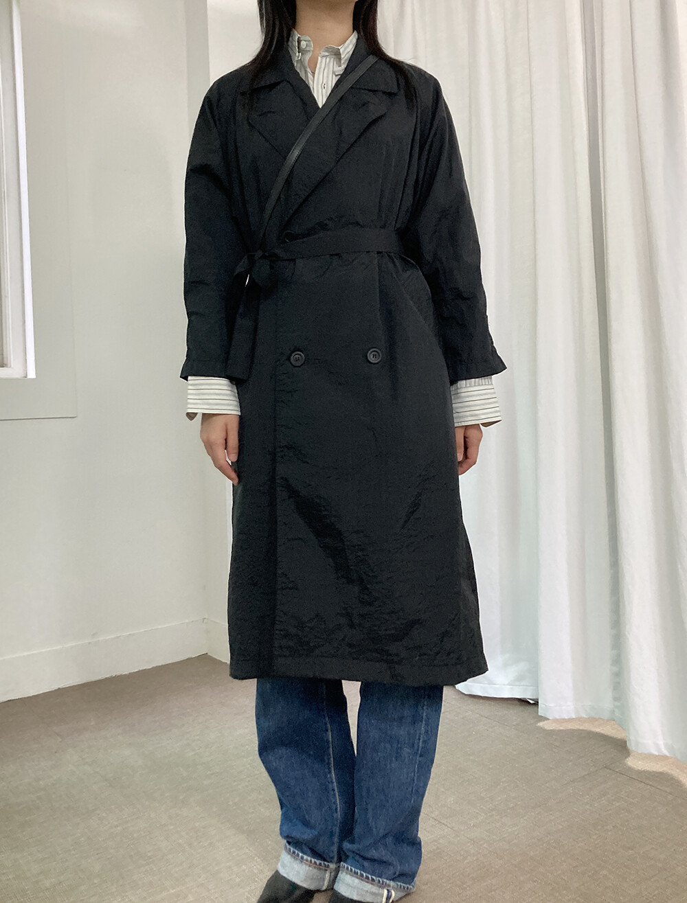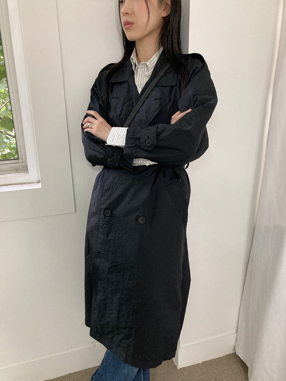 가벼운 나일론 소재의 블랙 트렌치코트입니다.