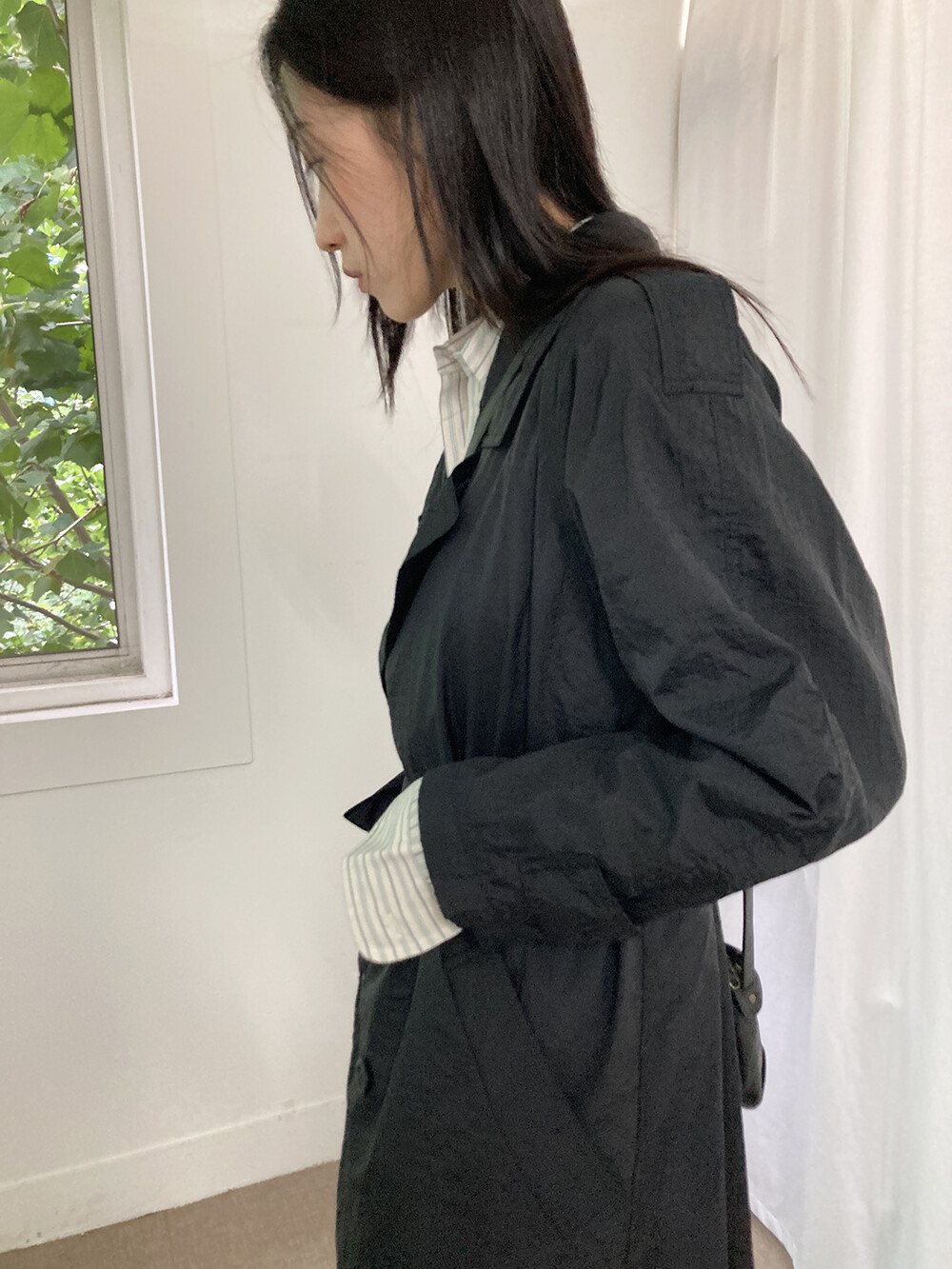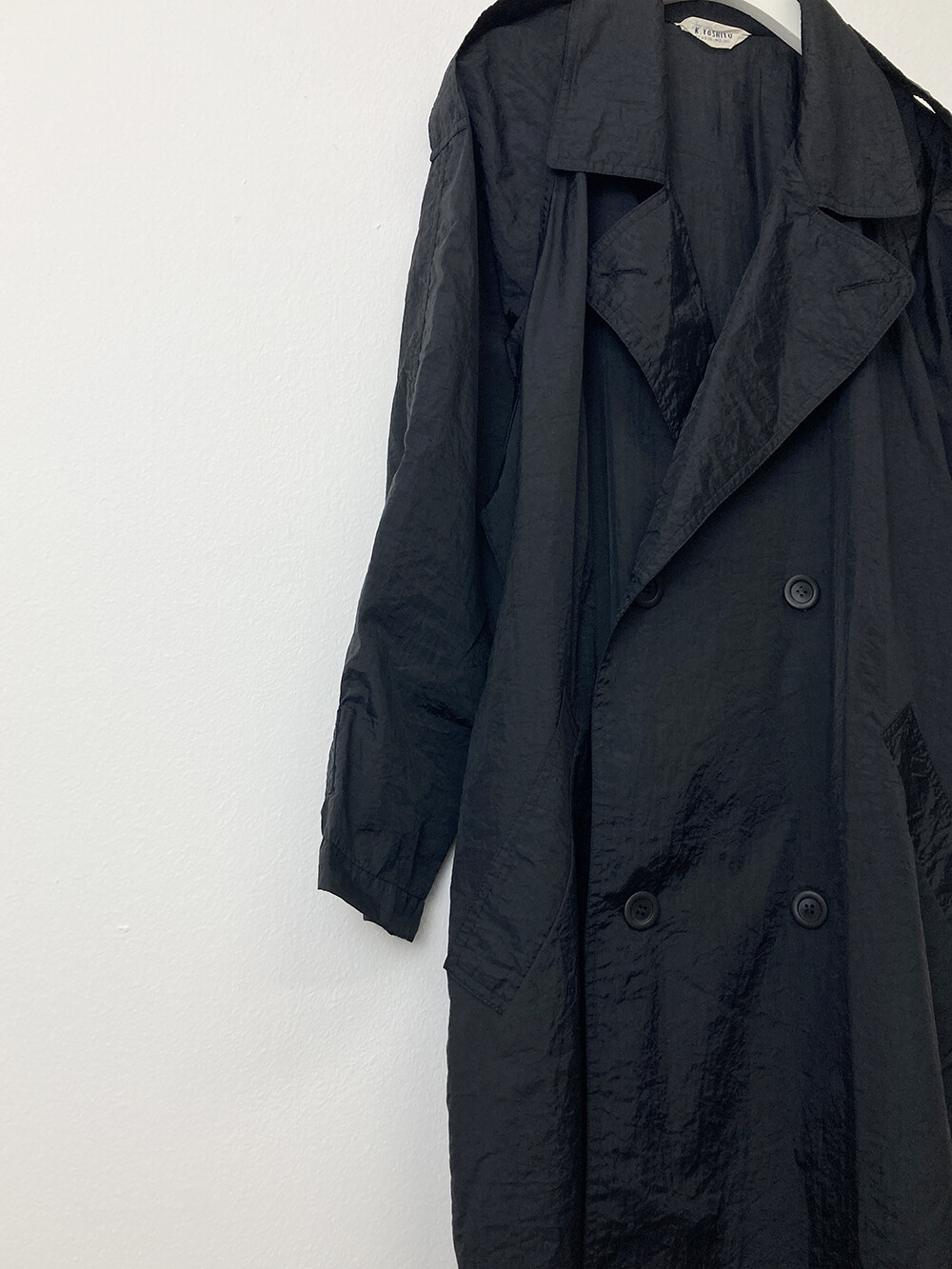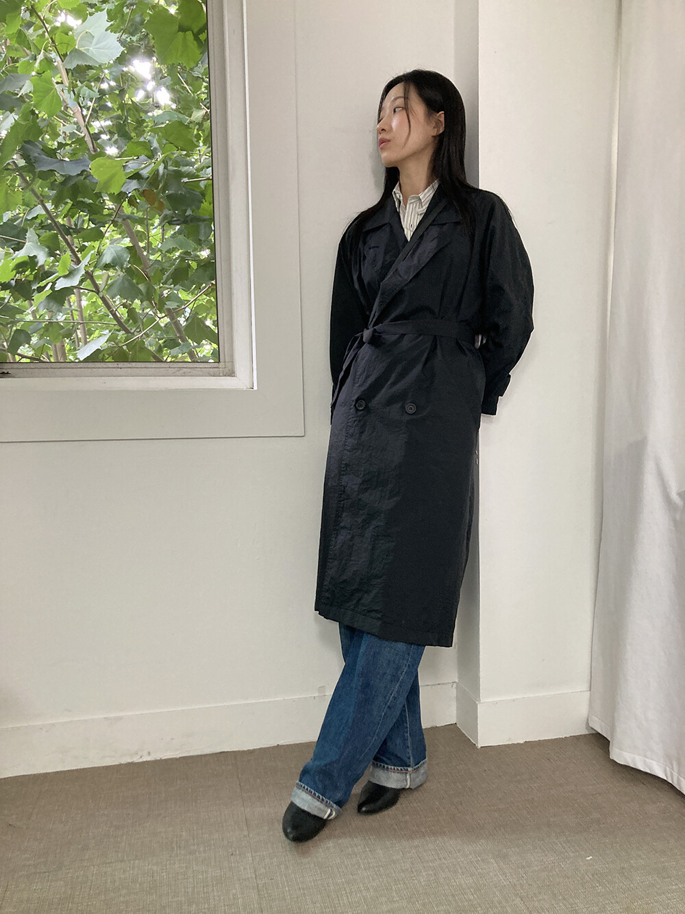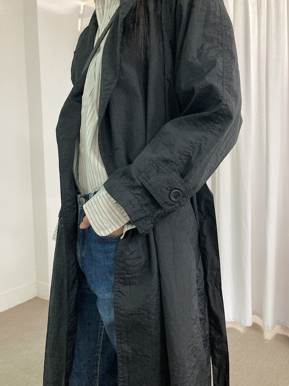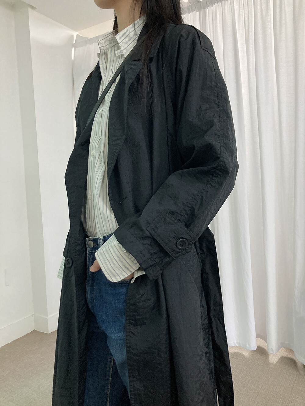 가벼운 나일론 소재의 블랙 트렌치코트입니다.