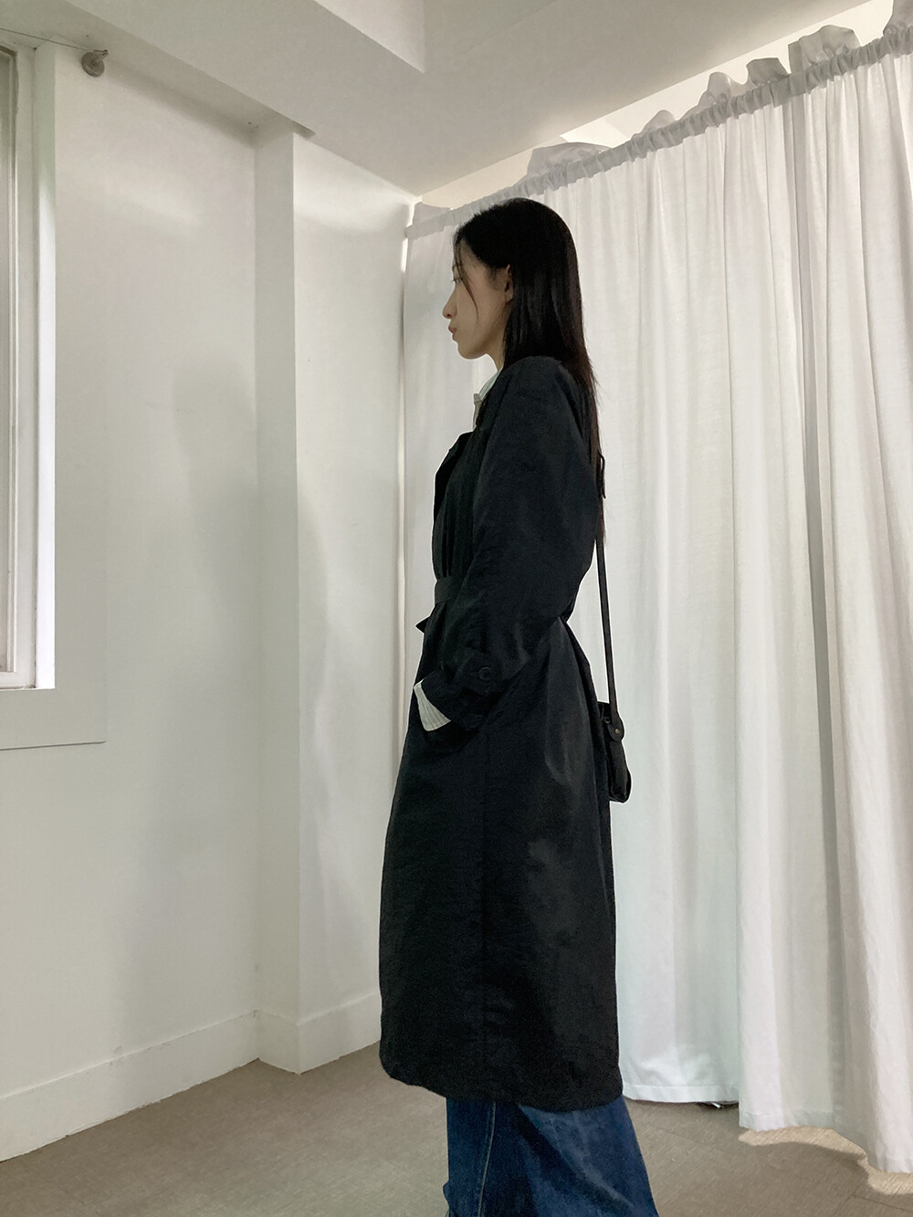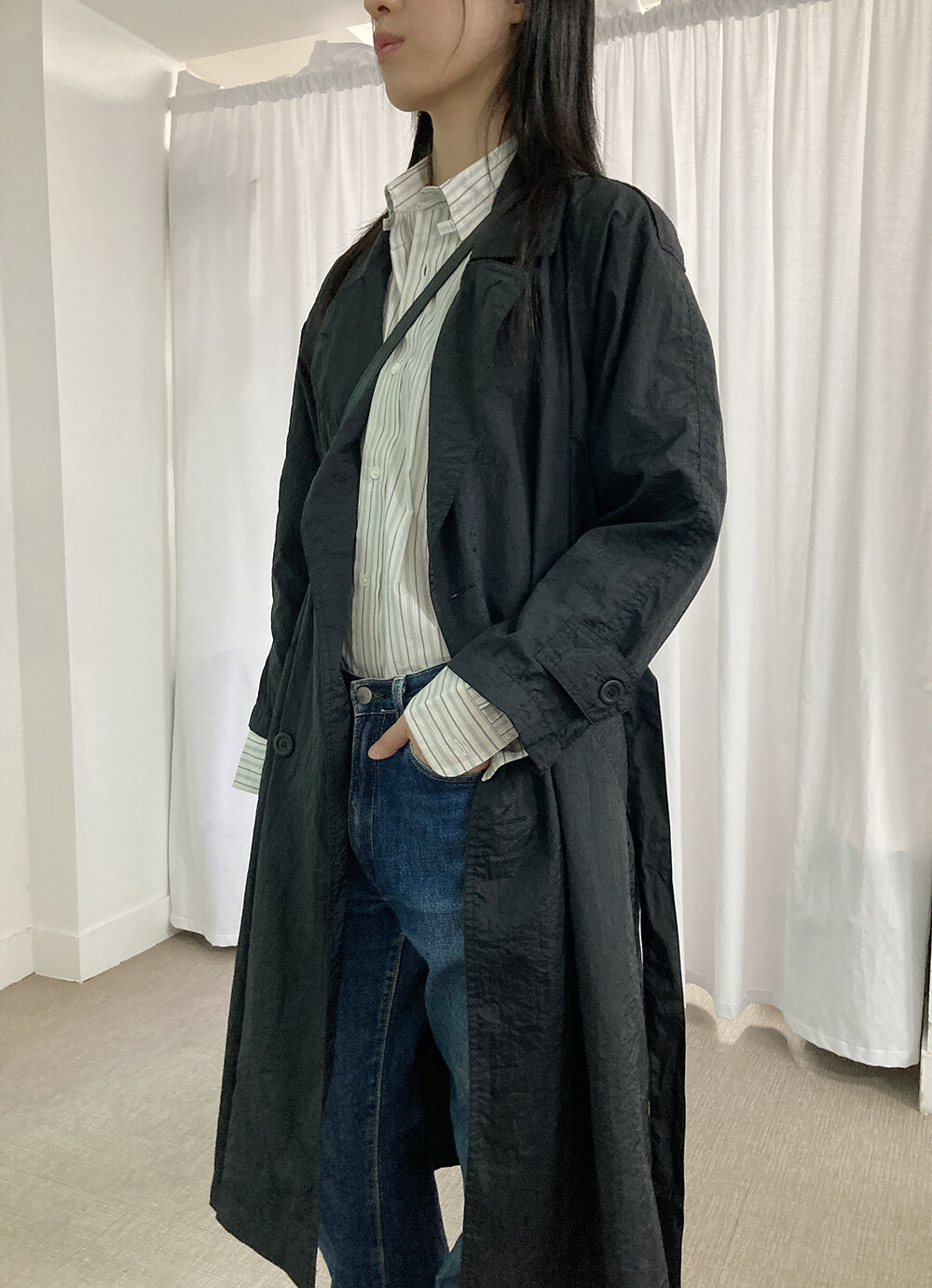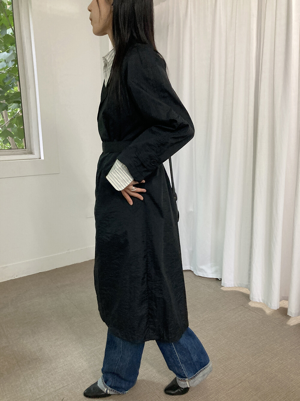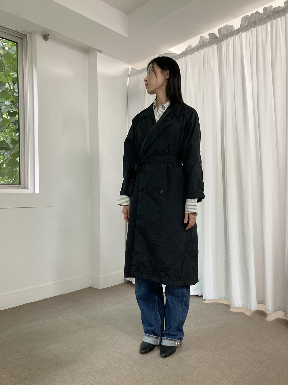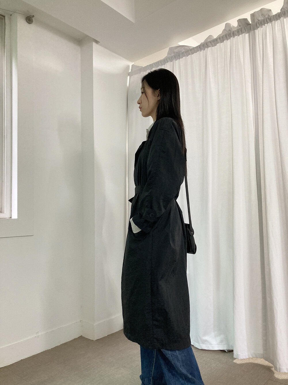 가벼운 나일론 소재의 블랙 트렌치코트입니다.