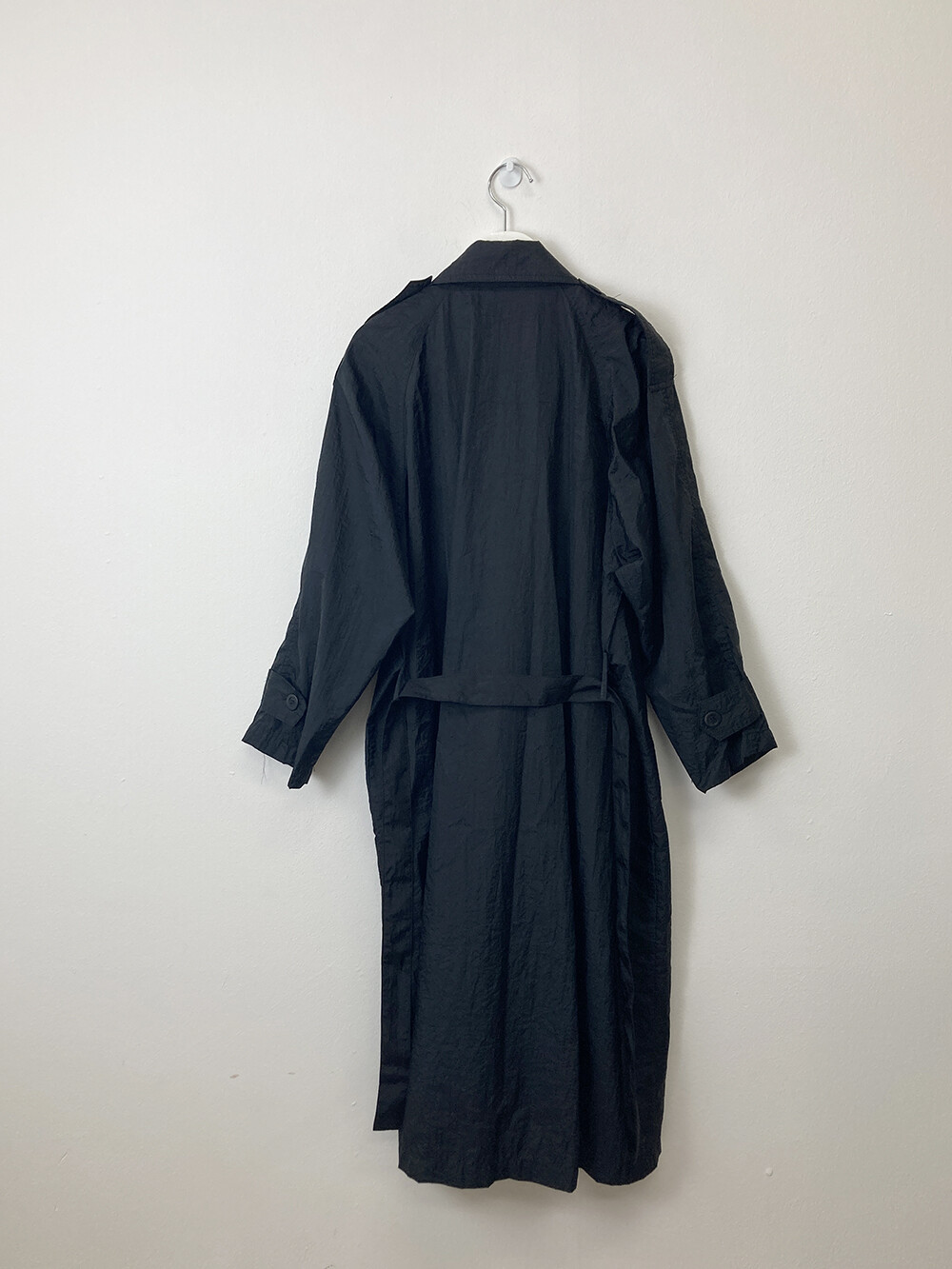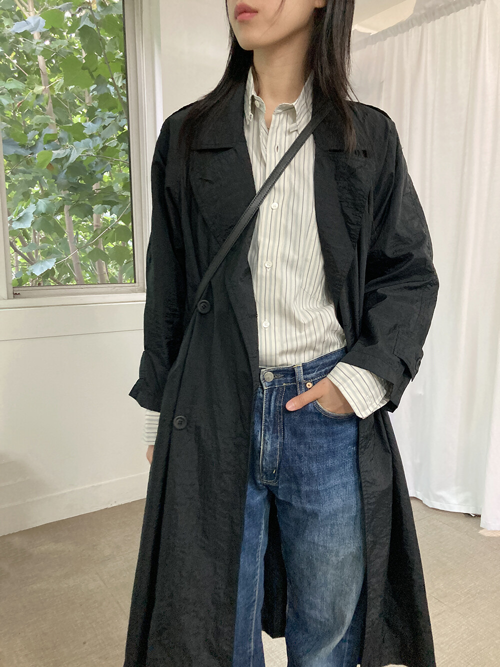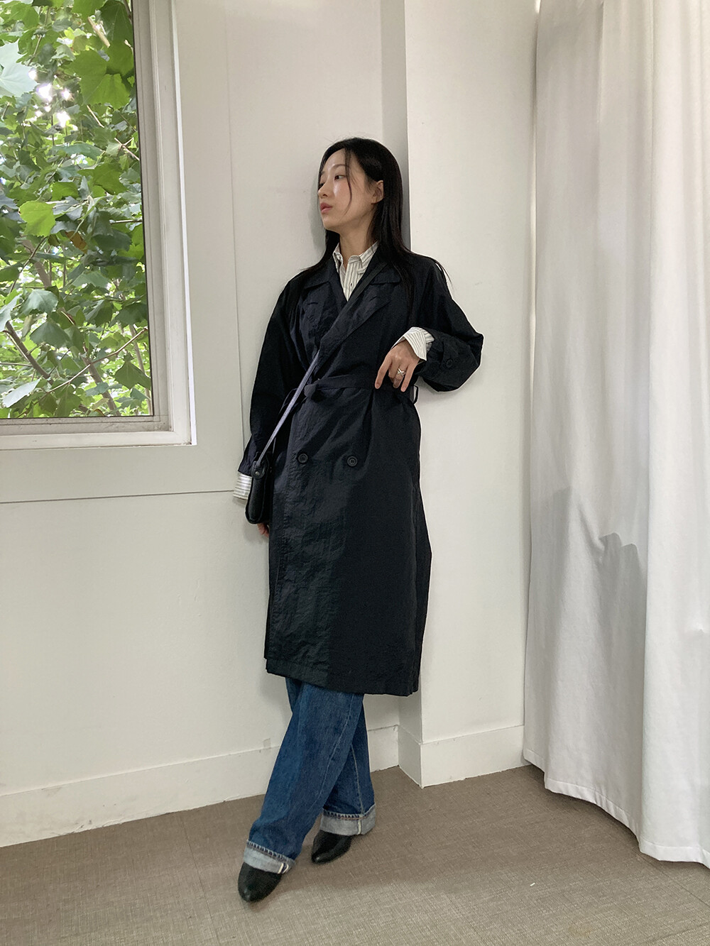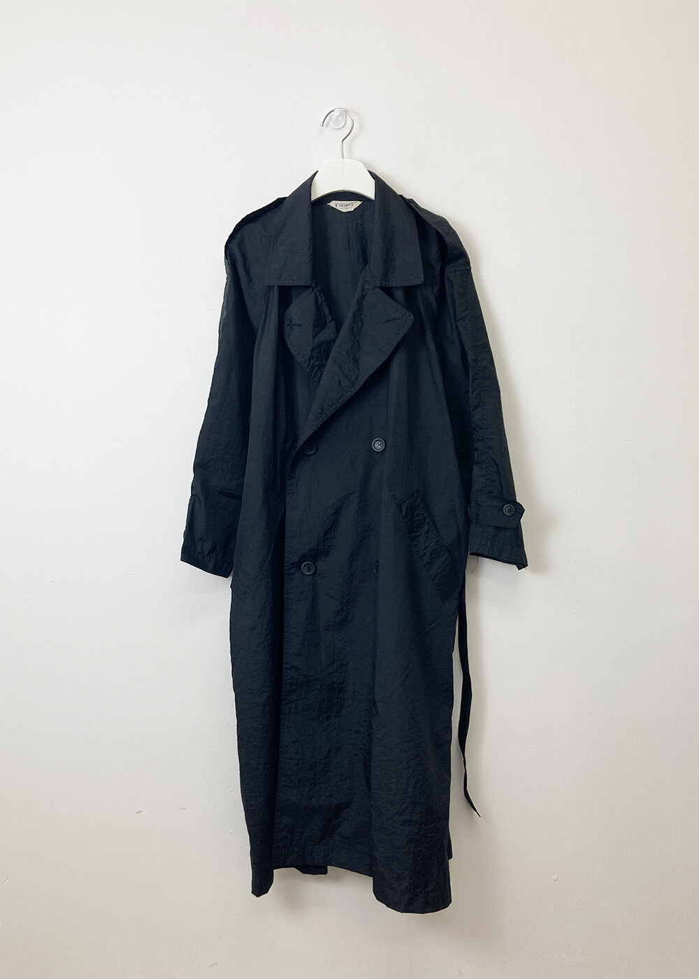 가벼운 나일론 소재의 블랙 트렌치코트입니다.