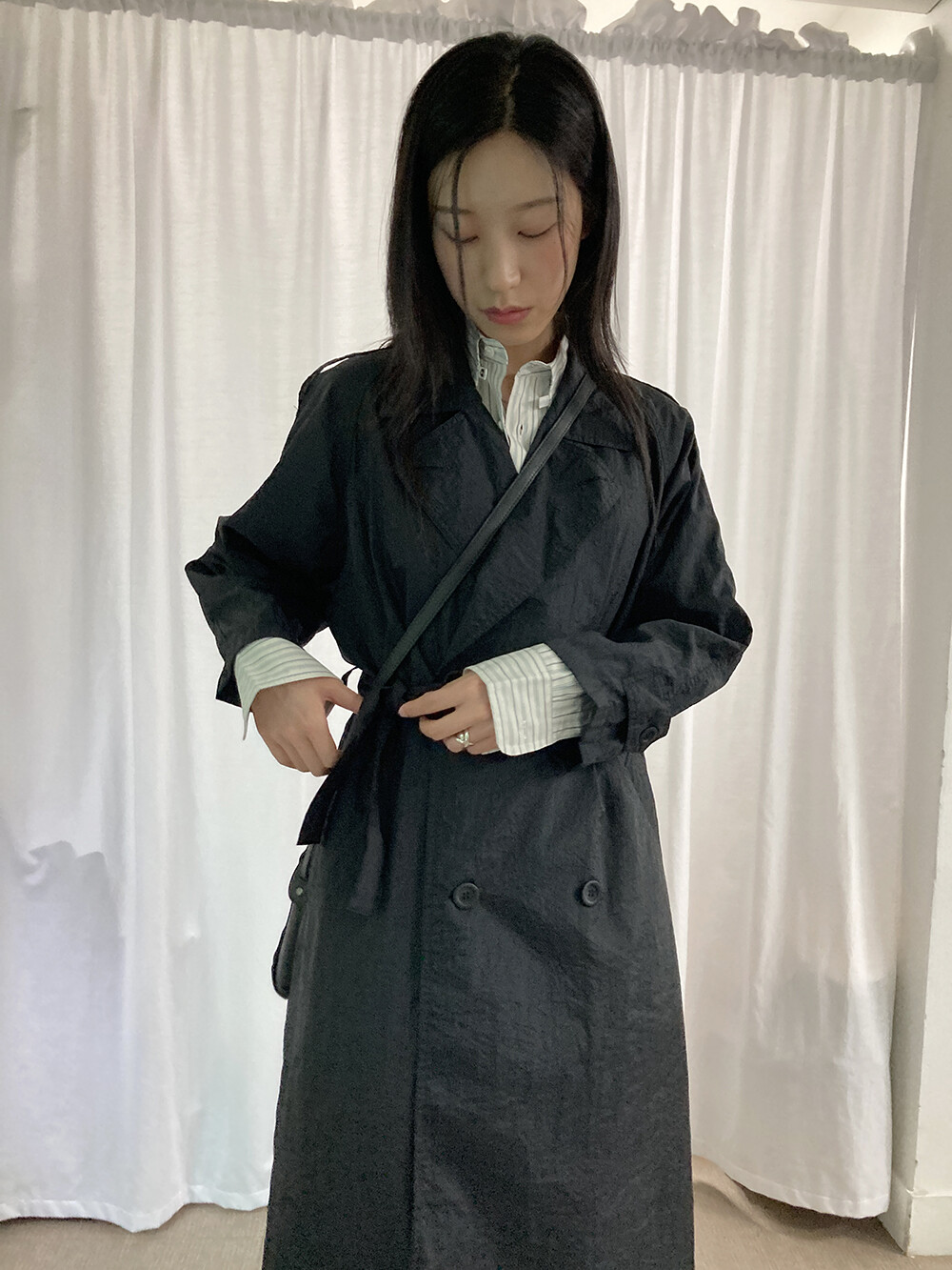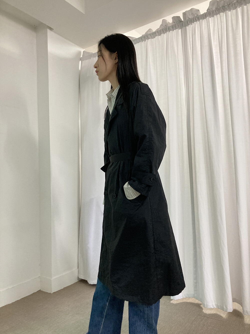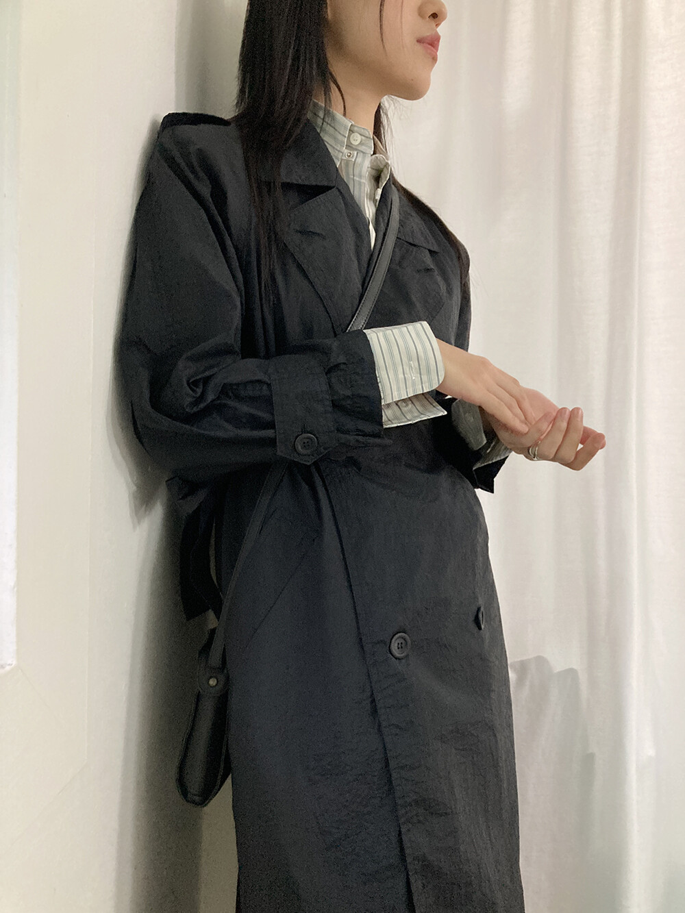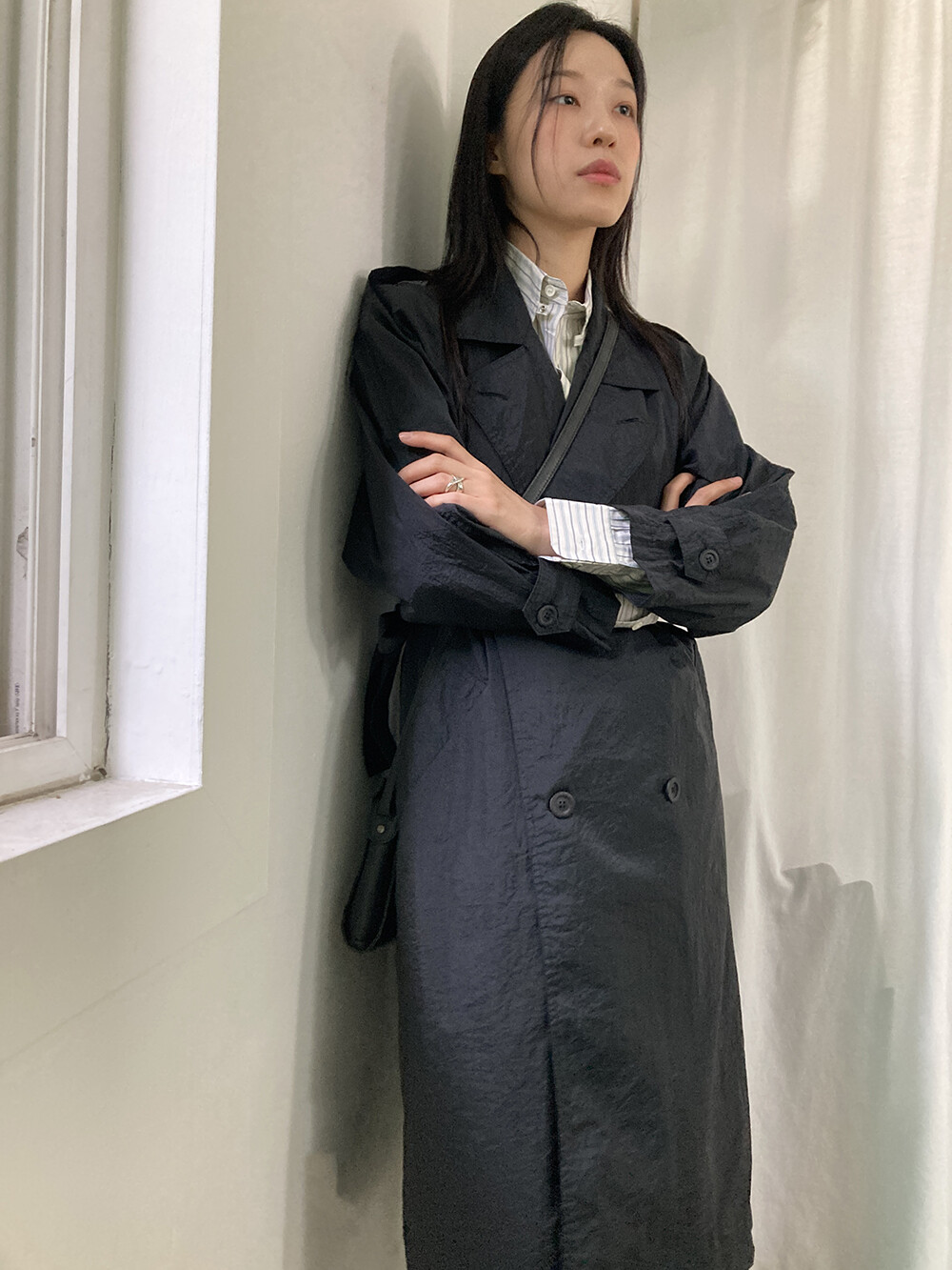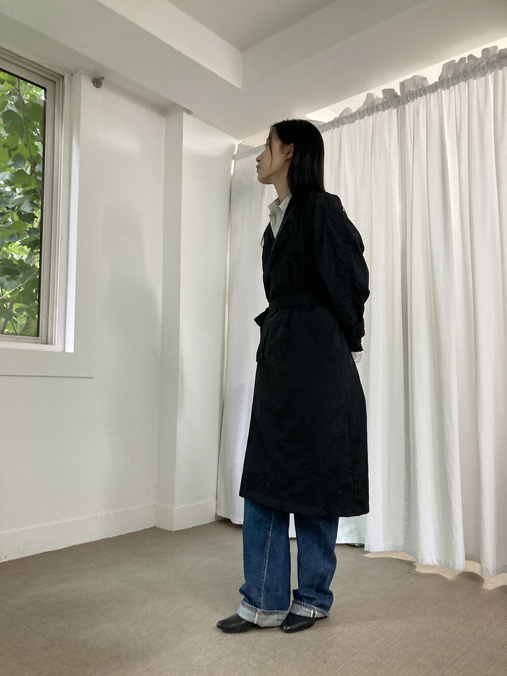 가벼운 나일론 소재의 블랙 트렌치코트입니다.