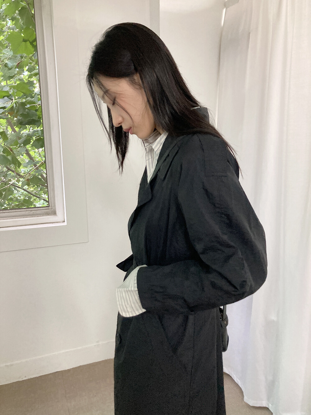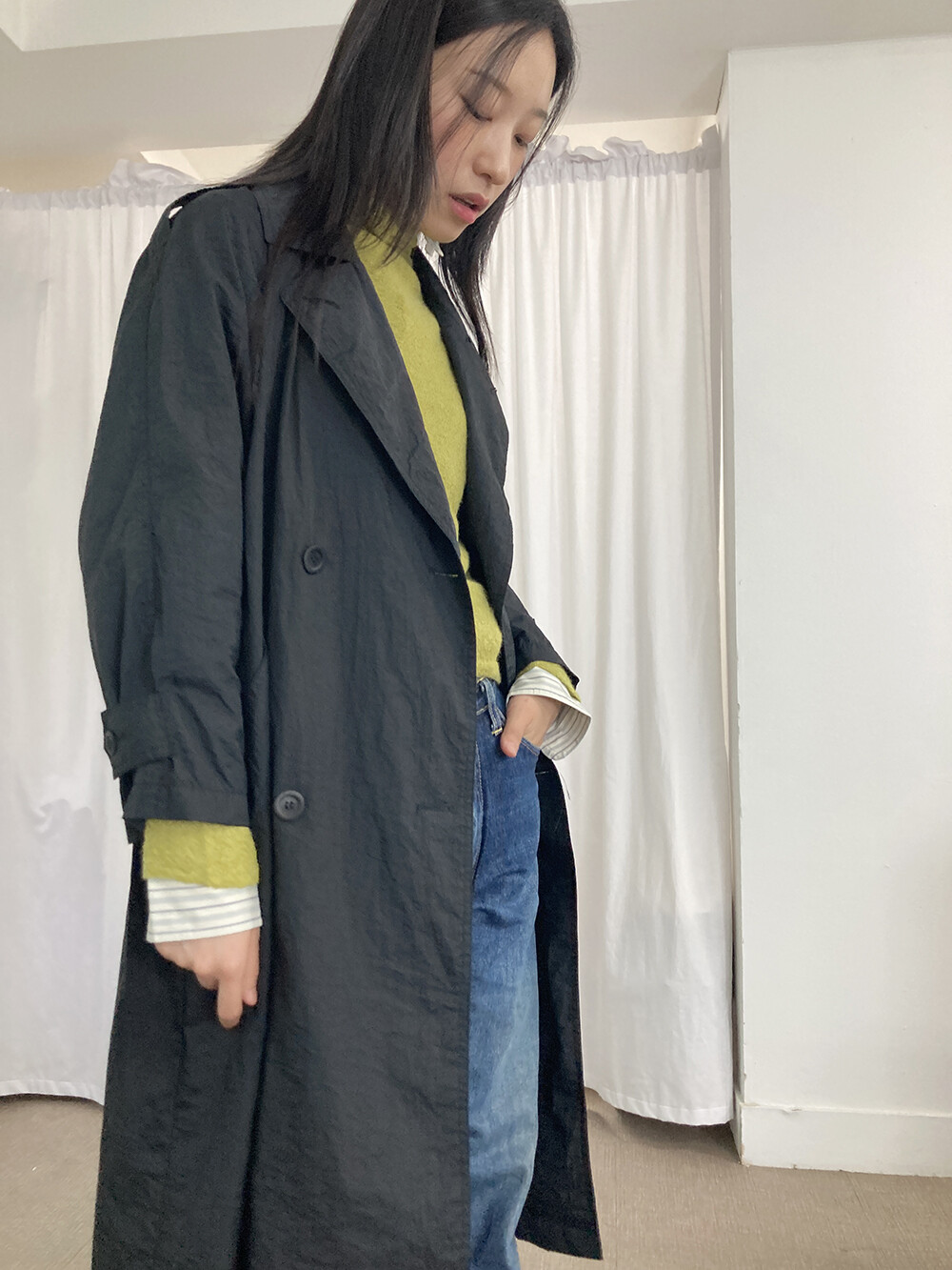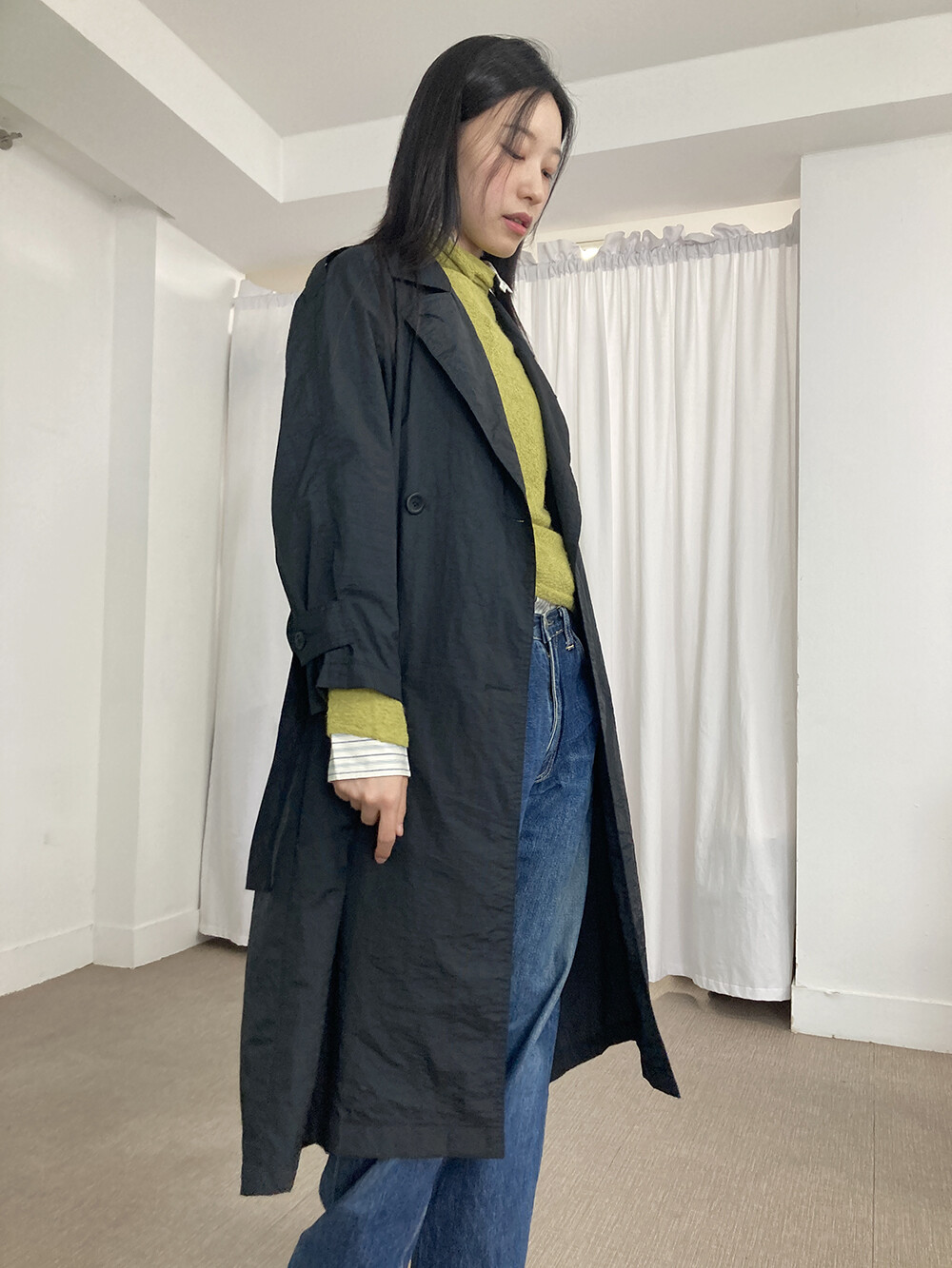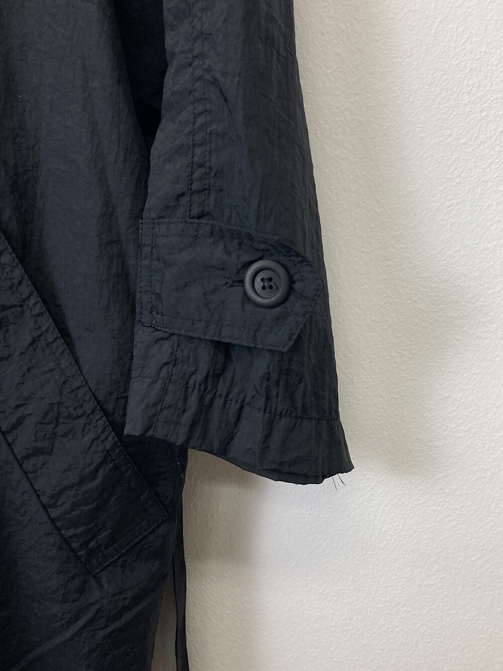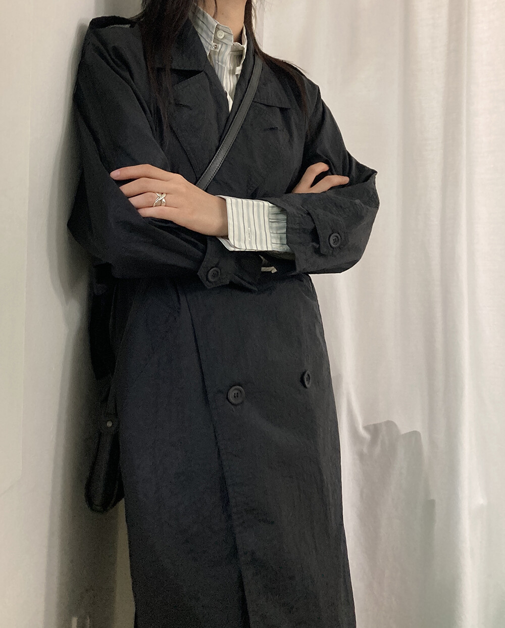 가벼운 나일론 소재의 블랙 트렌치코트입니다.