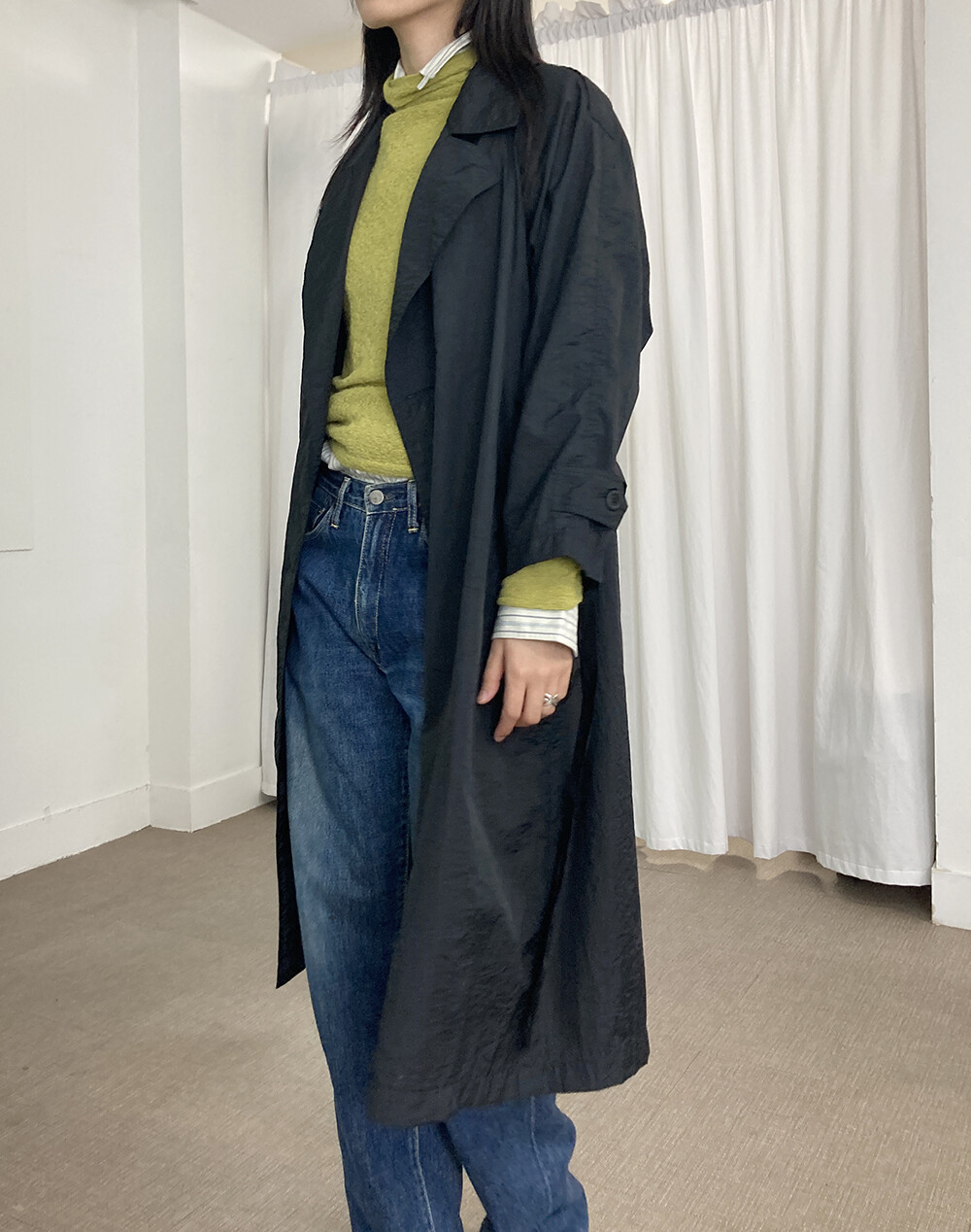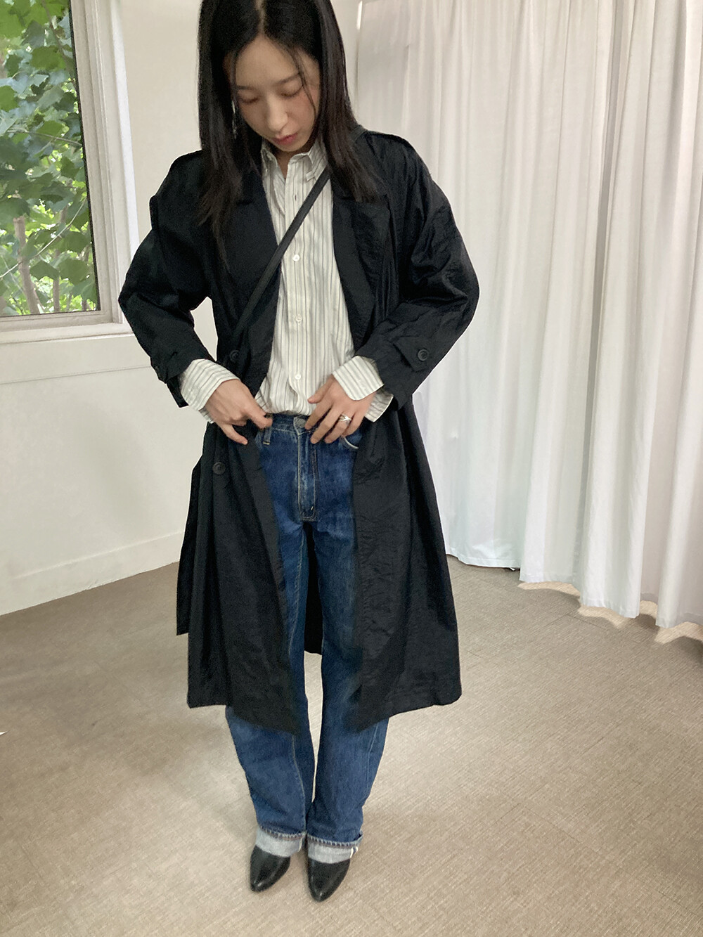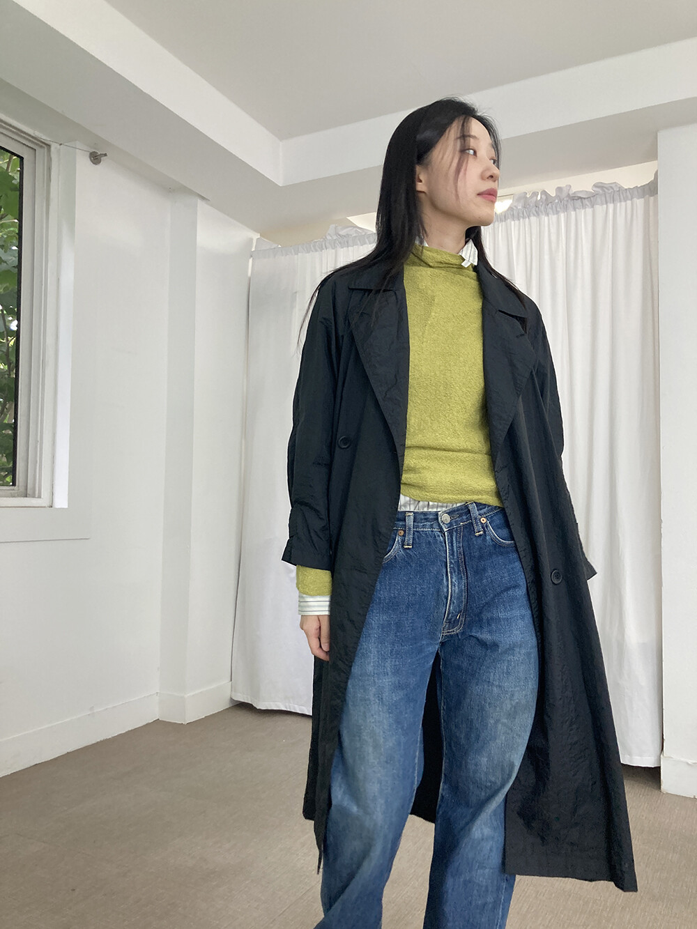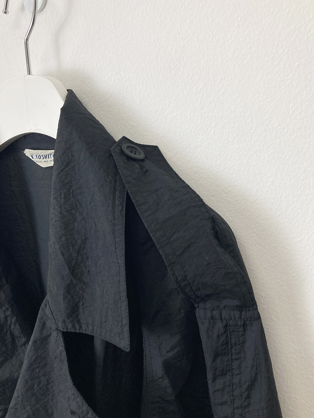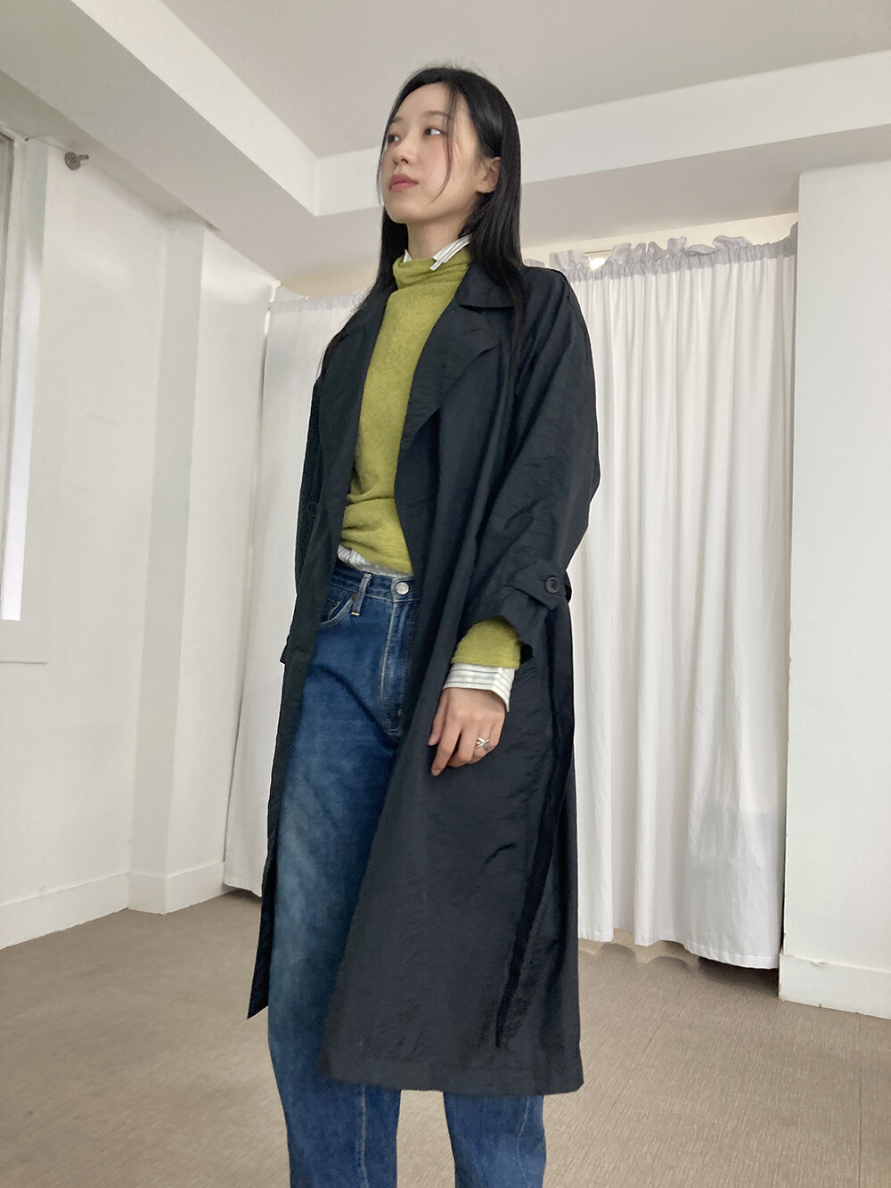가벼운 나일론 소재의 블랙 트렌치코트입니다.