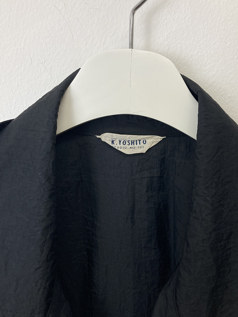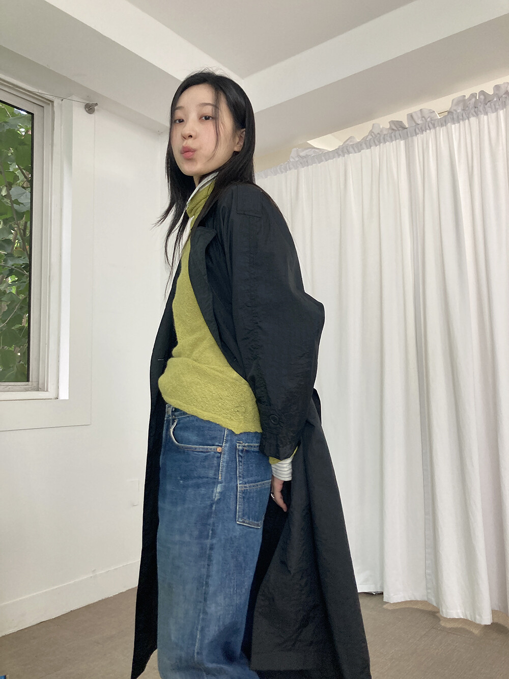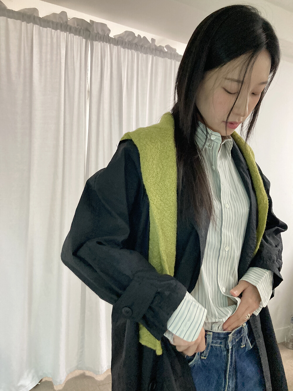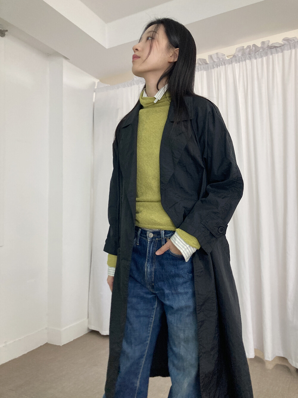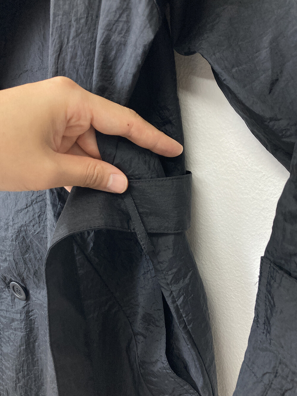 가벼운 나일론 소재의 블랙 트렌치코트입니다.
