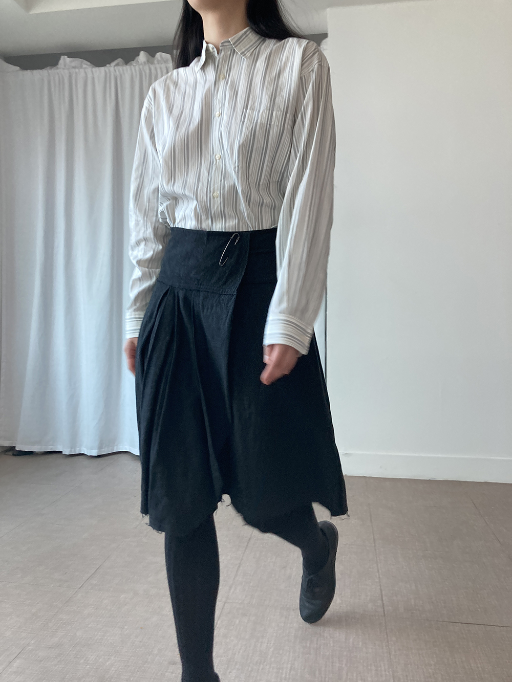 자연스러운 밑단 처리와 데일리로 착용하기 좋을 기장감의 스커트입니다.
