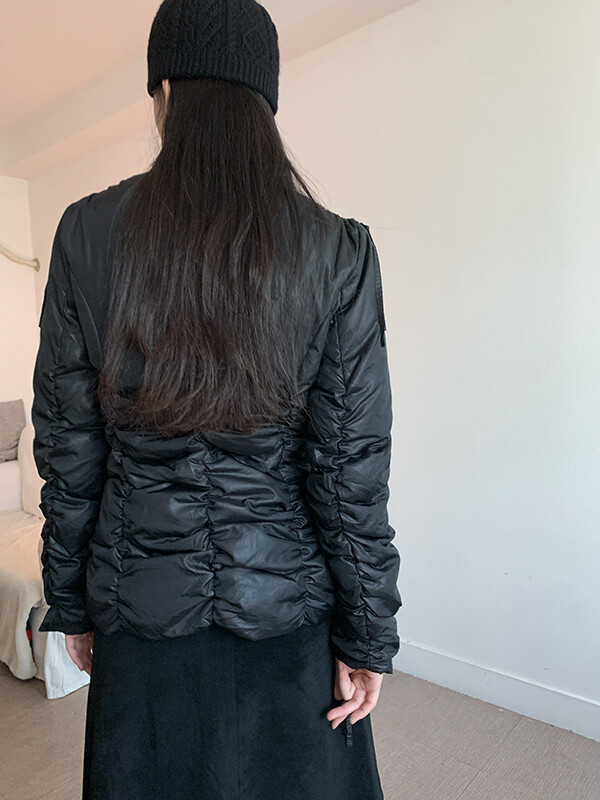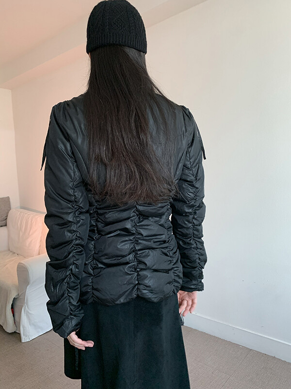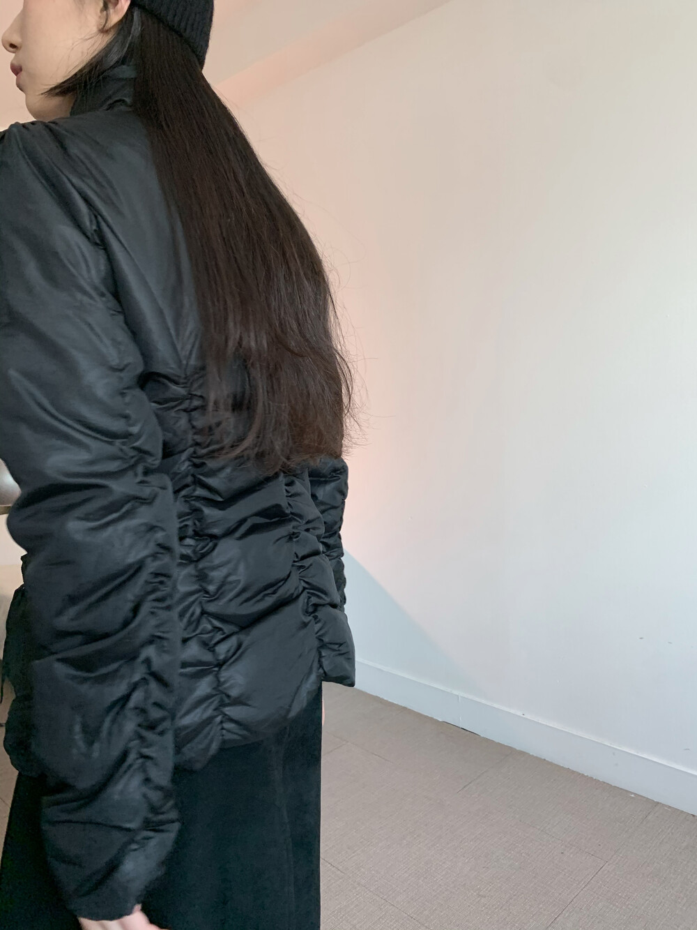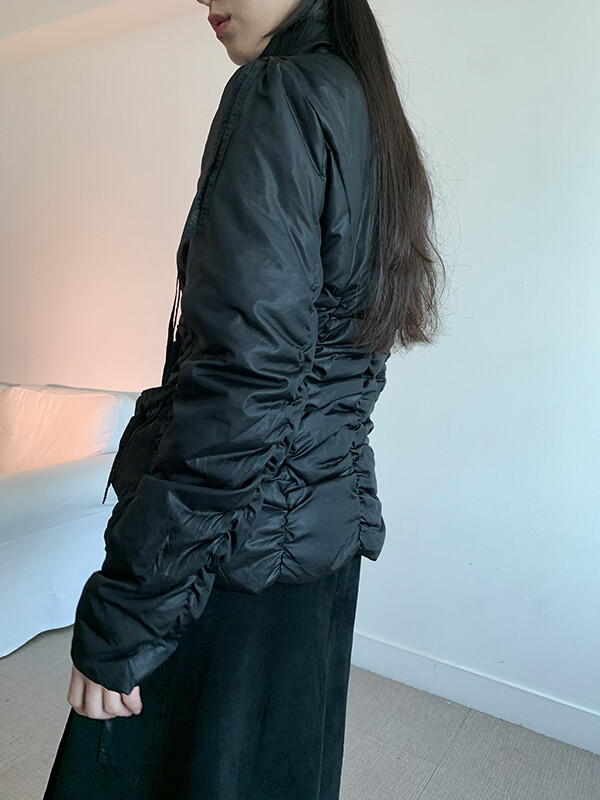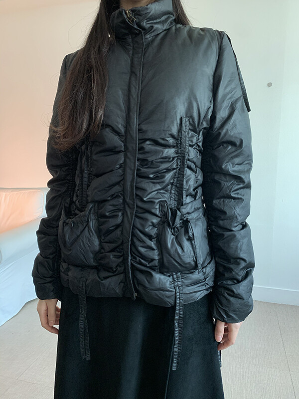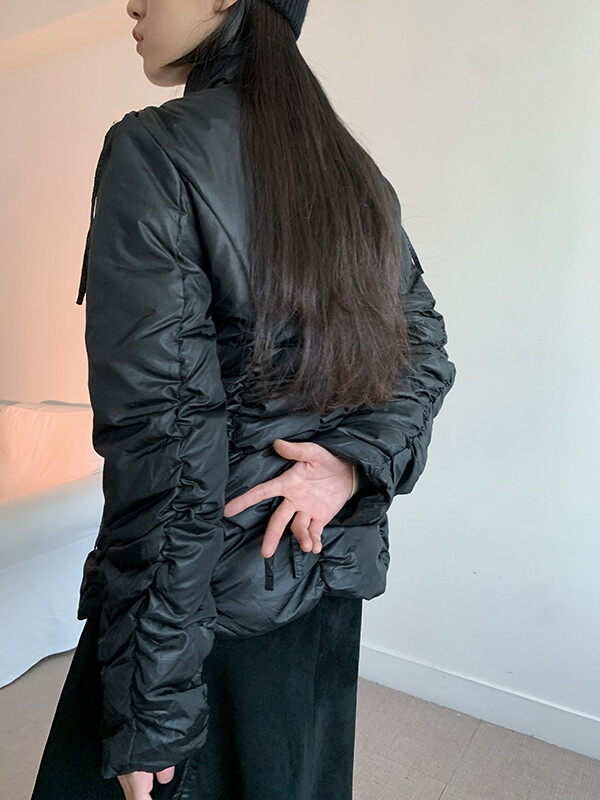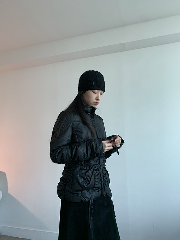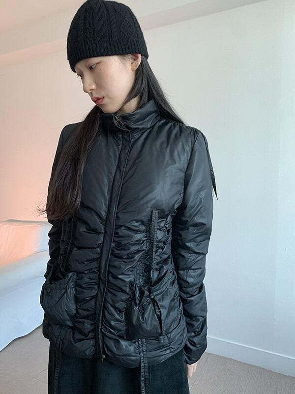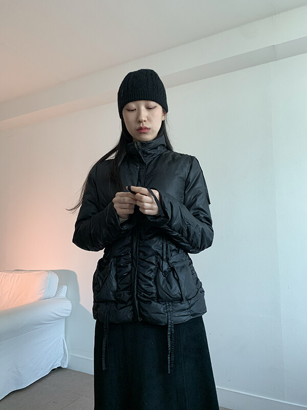 끈과, 주름 디테일이 독특한 패딩입니다.