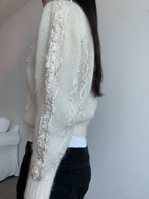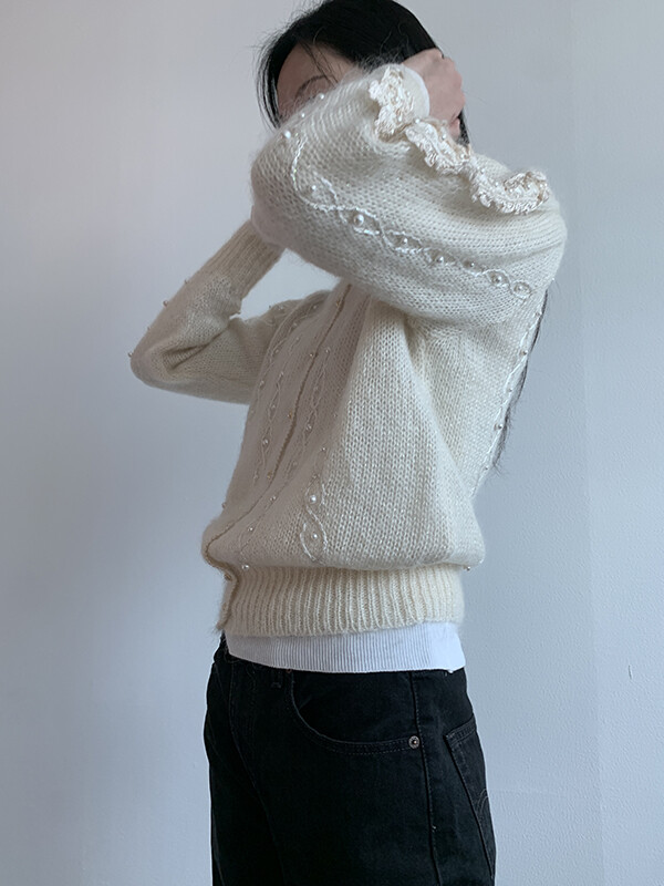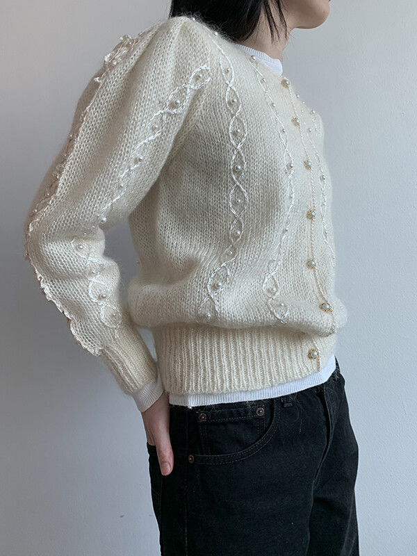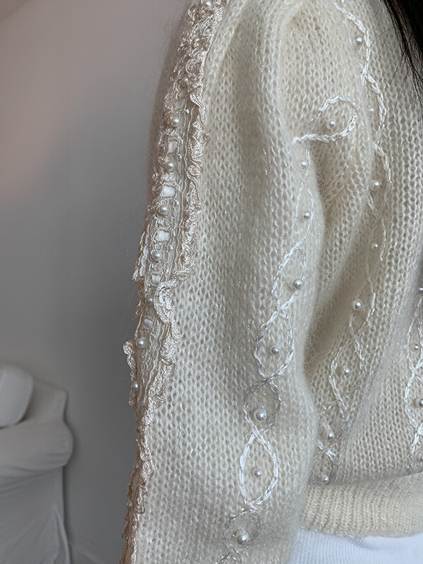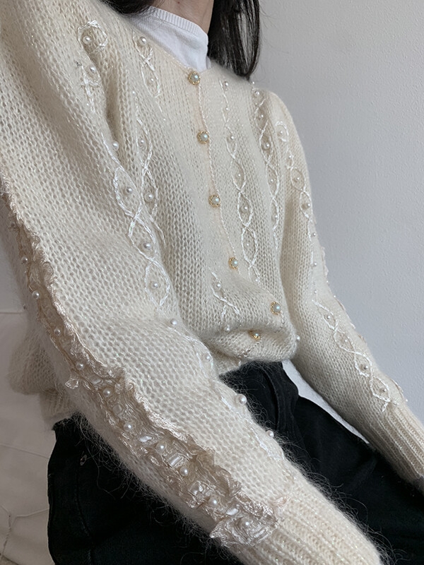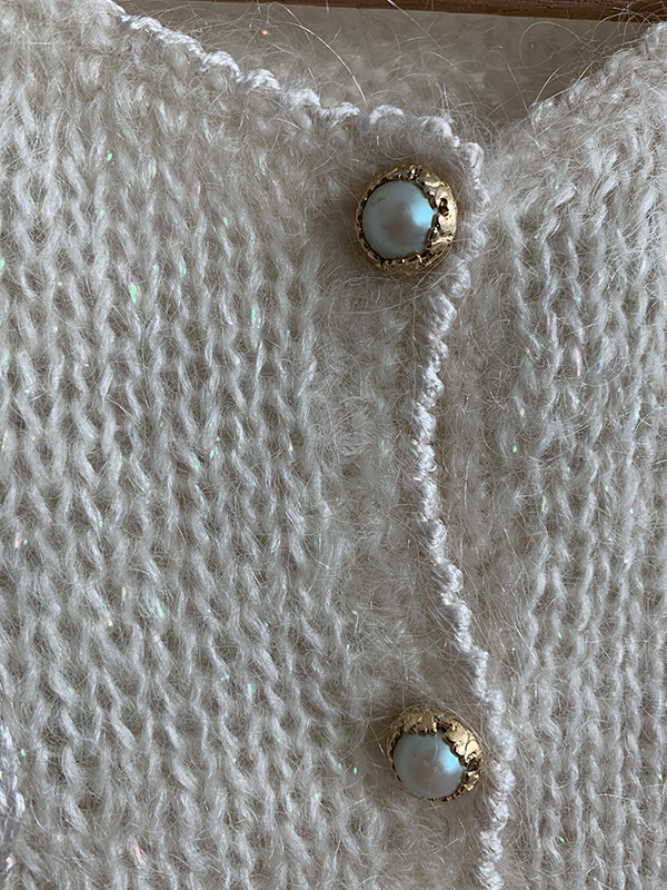 반짝이는 원사가 섞여있으며, 진주버튼도 영롱하며 독특합니다.