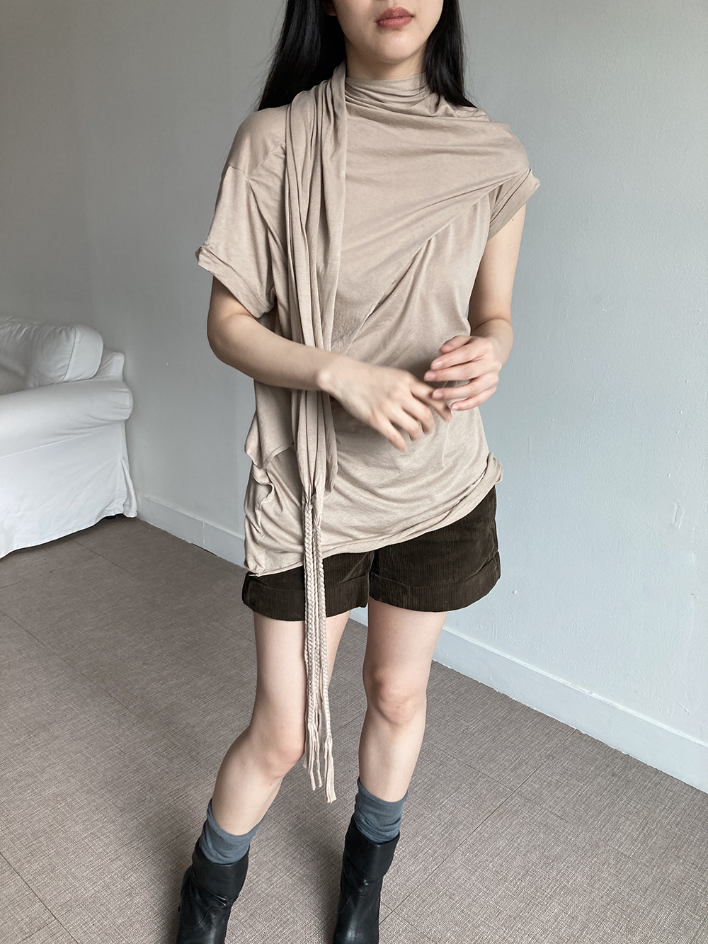 BCBG MAXAZRIA의 머플러가 붙어 있는 독특한 디자인의 티셔츠입니다.