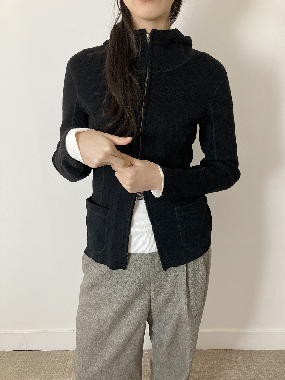Wool black hood zip-up