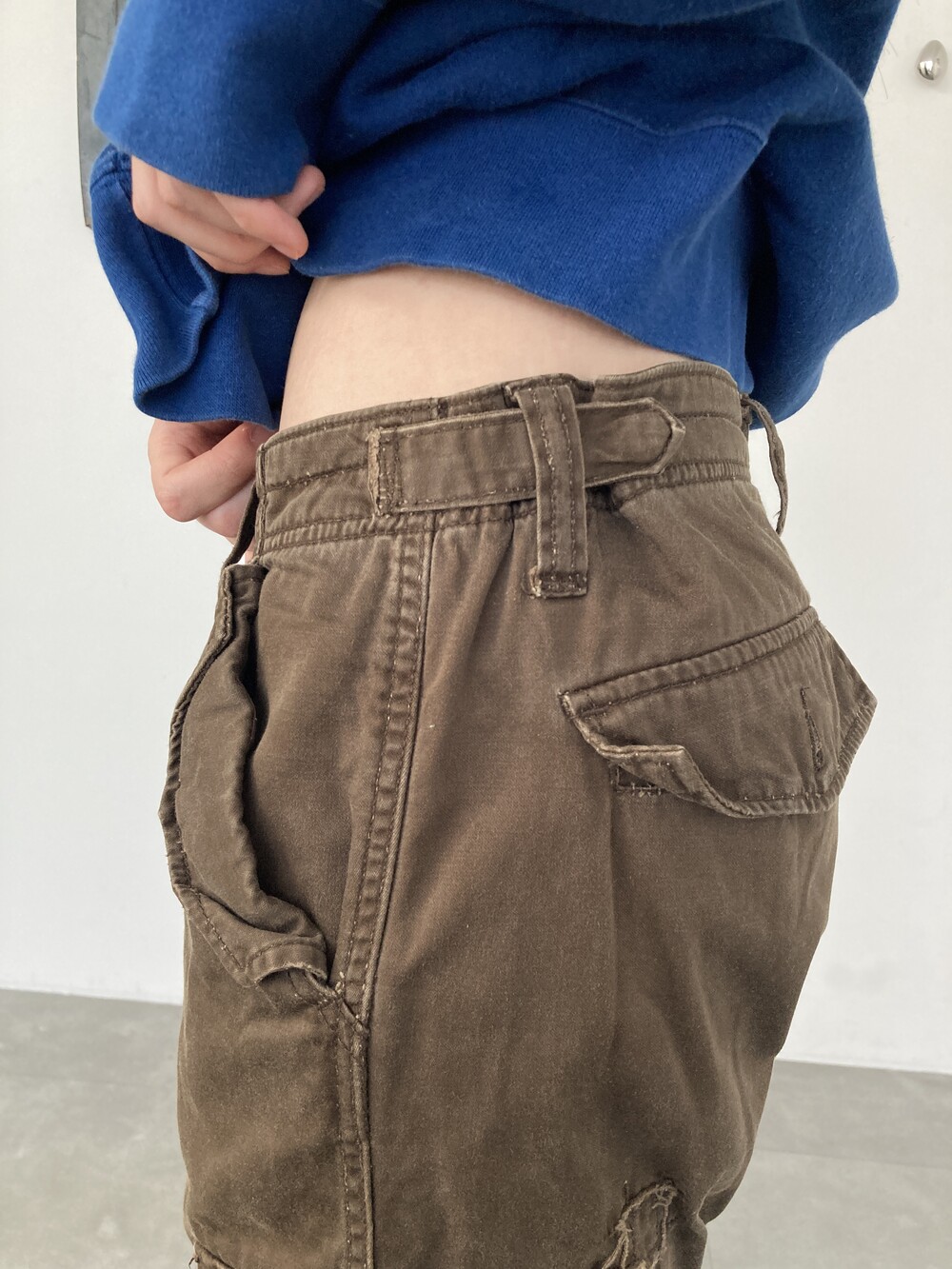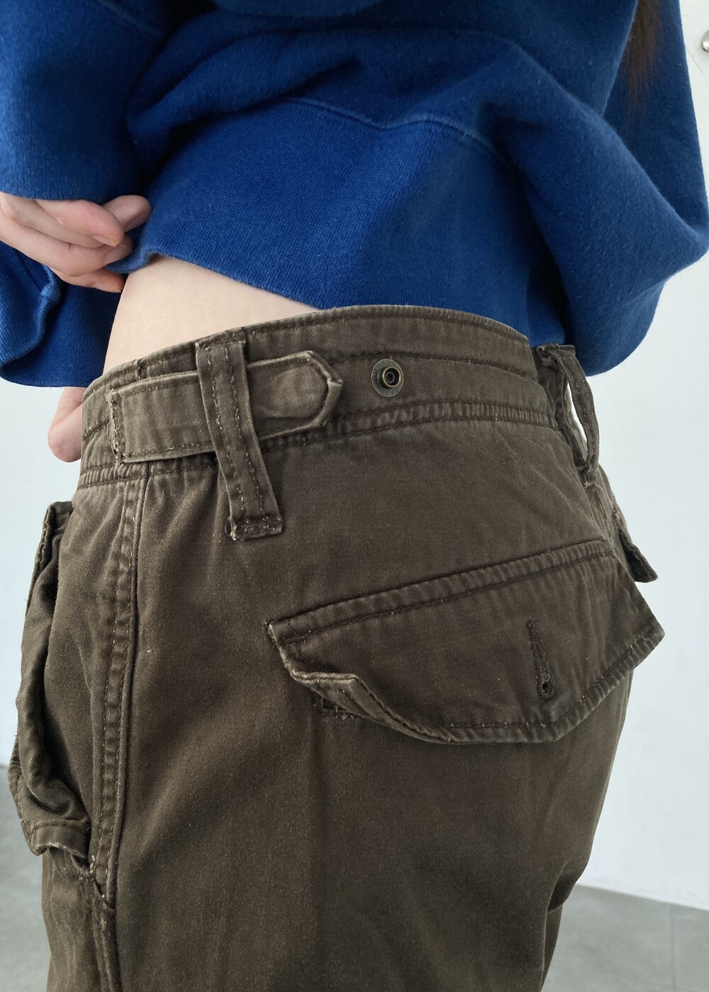 허리에는 사이즈를 조절할 수 있는 돗도버튼이 있어, M 착용 분들까지는 골반에 걸쳐 착용될 사이즈 입니다 (정확한 사이즈는 상세사이즈를 확인해주세요)