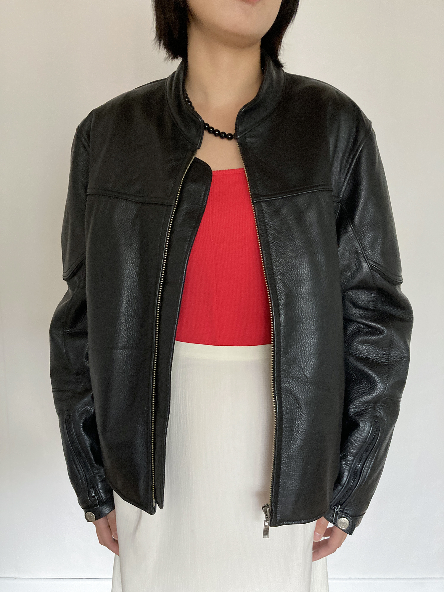 black leather zip-up jacket