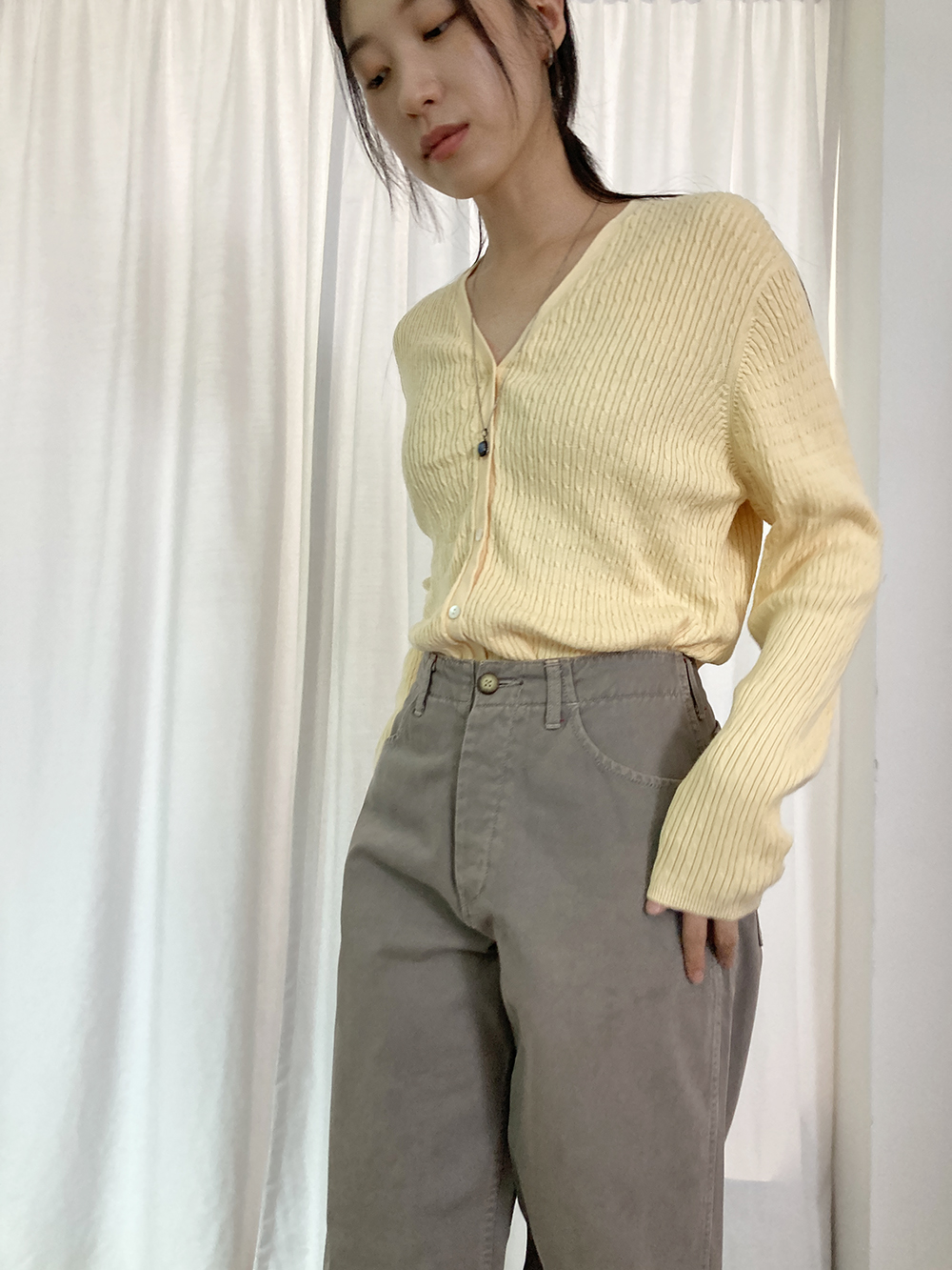 LAND’S END 파스텔 옐로우 컬러의 니트 가디건입니다.
