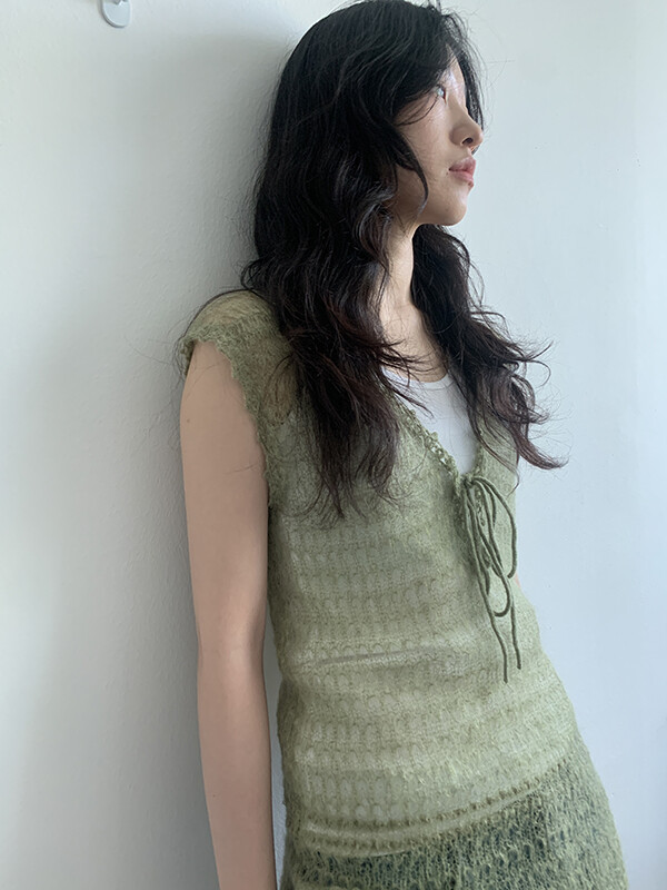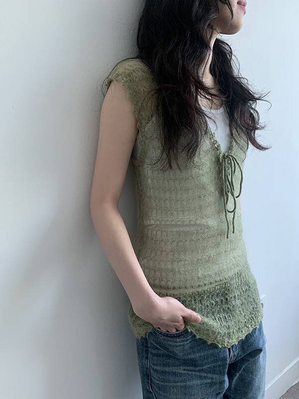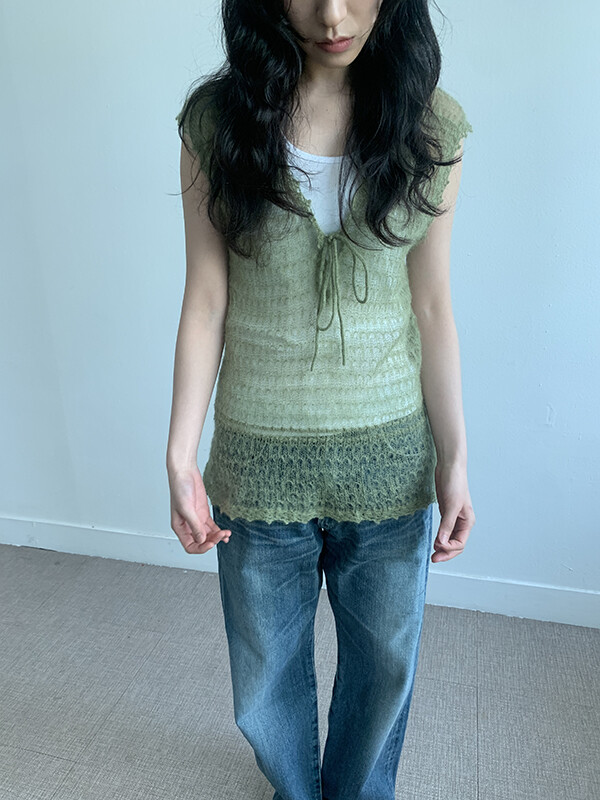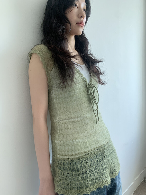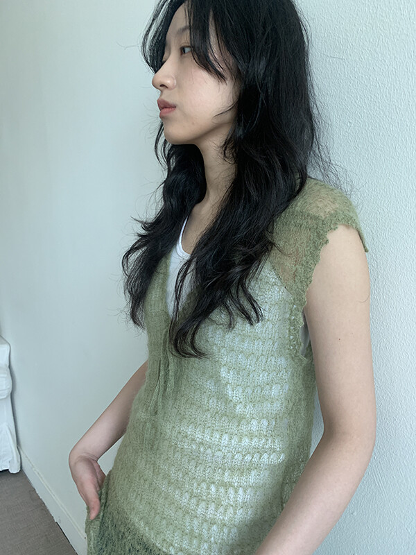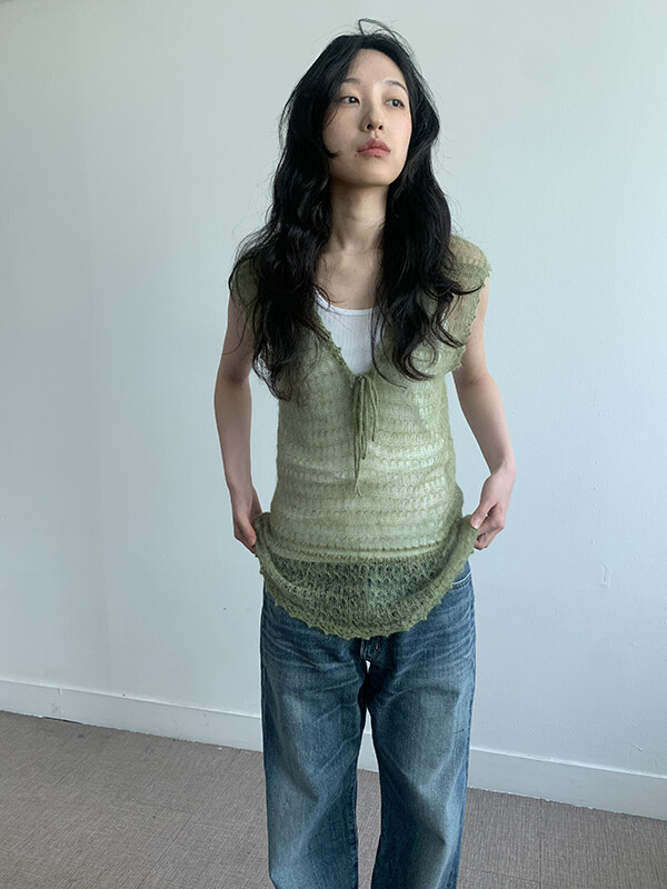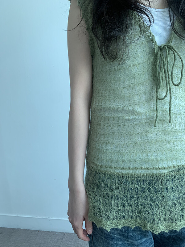 그린 컬러의 얇은 니트 슬리브리스입니다.