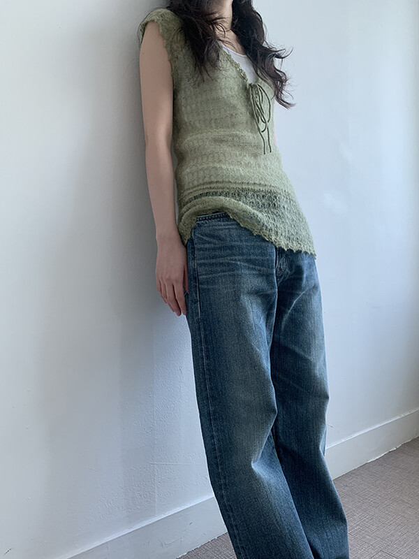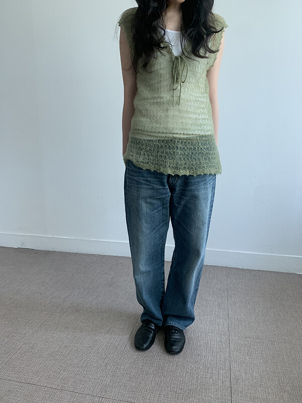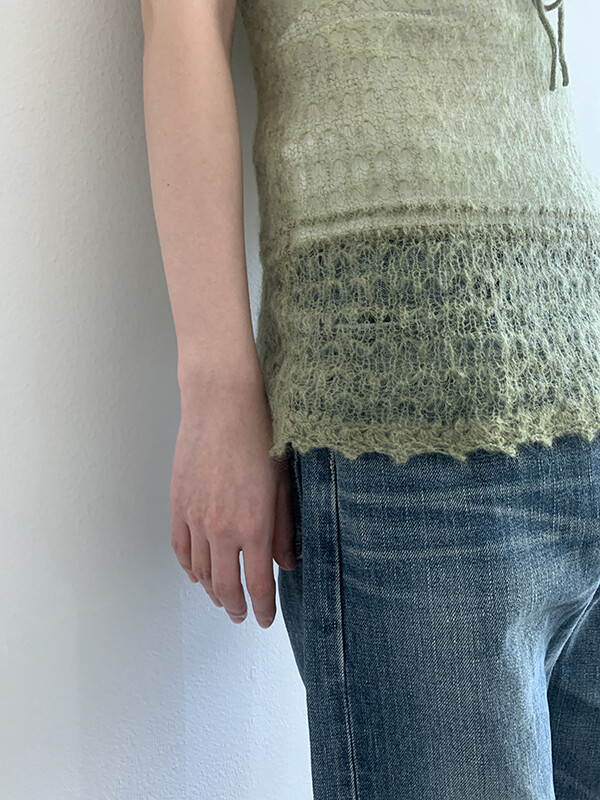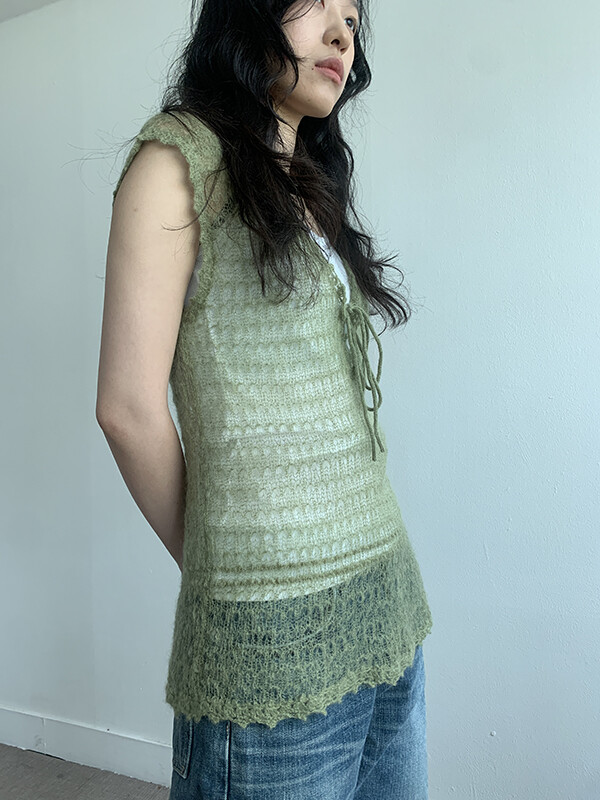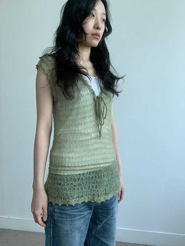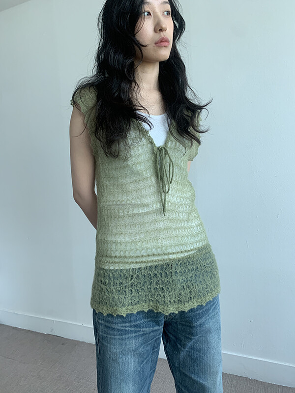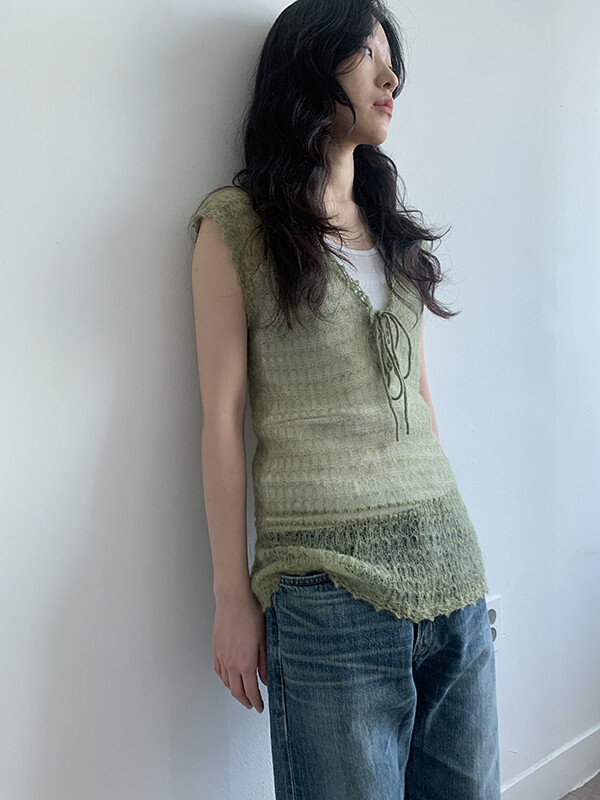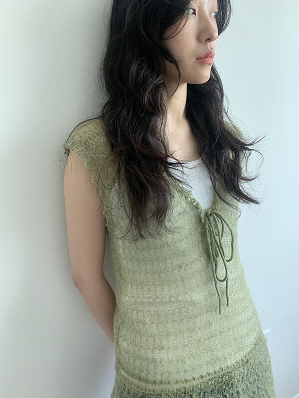 그린 컬러의 얇은 니트 슬리브리스입니다.