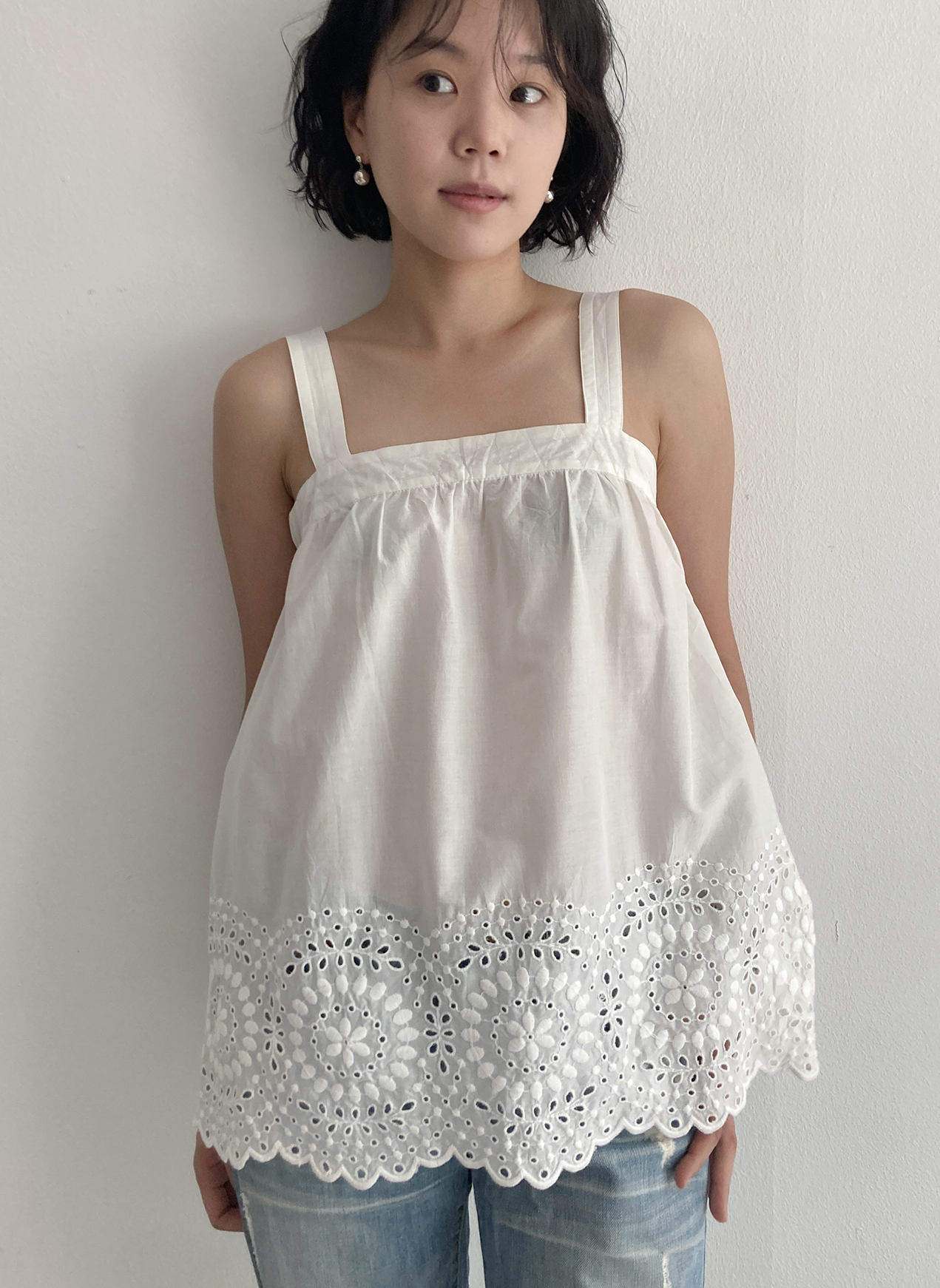 한여름 활용하기 좋은 화이트 코튼 슬리브리스입니다.